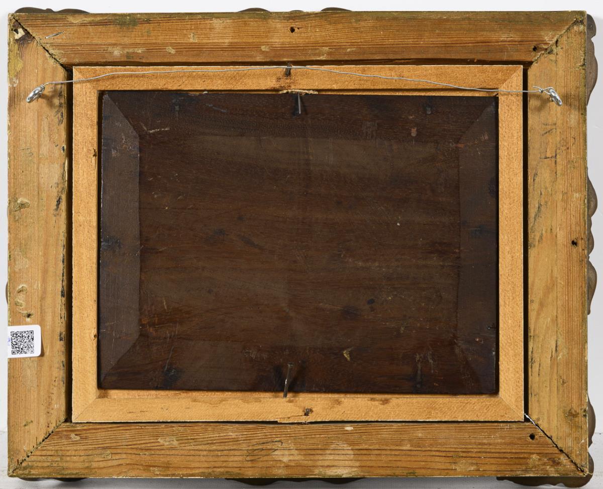 Scene reminiscent of 18th century pastoral landscape painting with a narrow river where cattle are drinking and a pair of shepherds are resting. Marks of age.