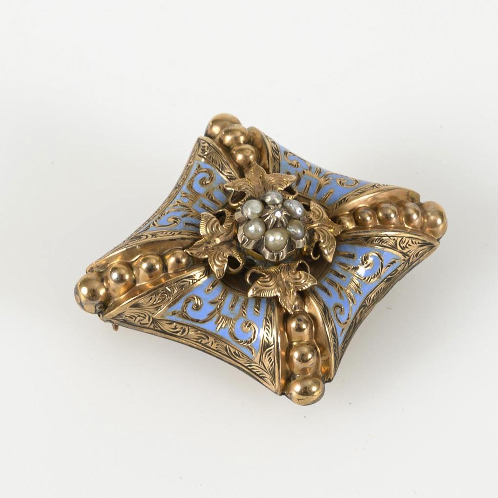 Relief brooch with pearl-studded mounting, engravings and partial enameling. Glazed framed back, small suspension loop. Ball hook added.