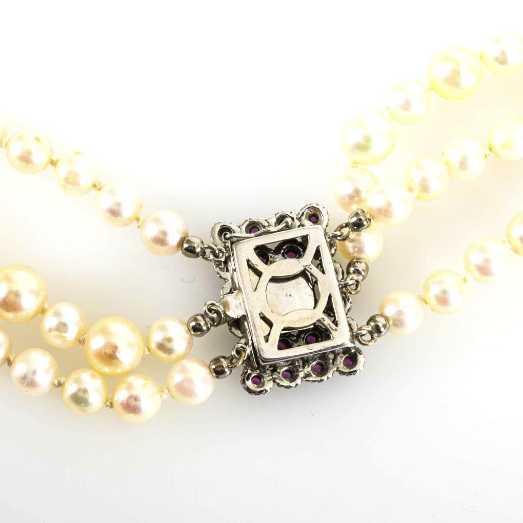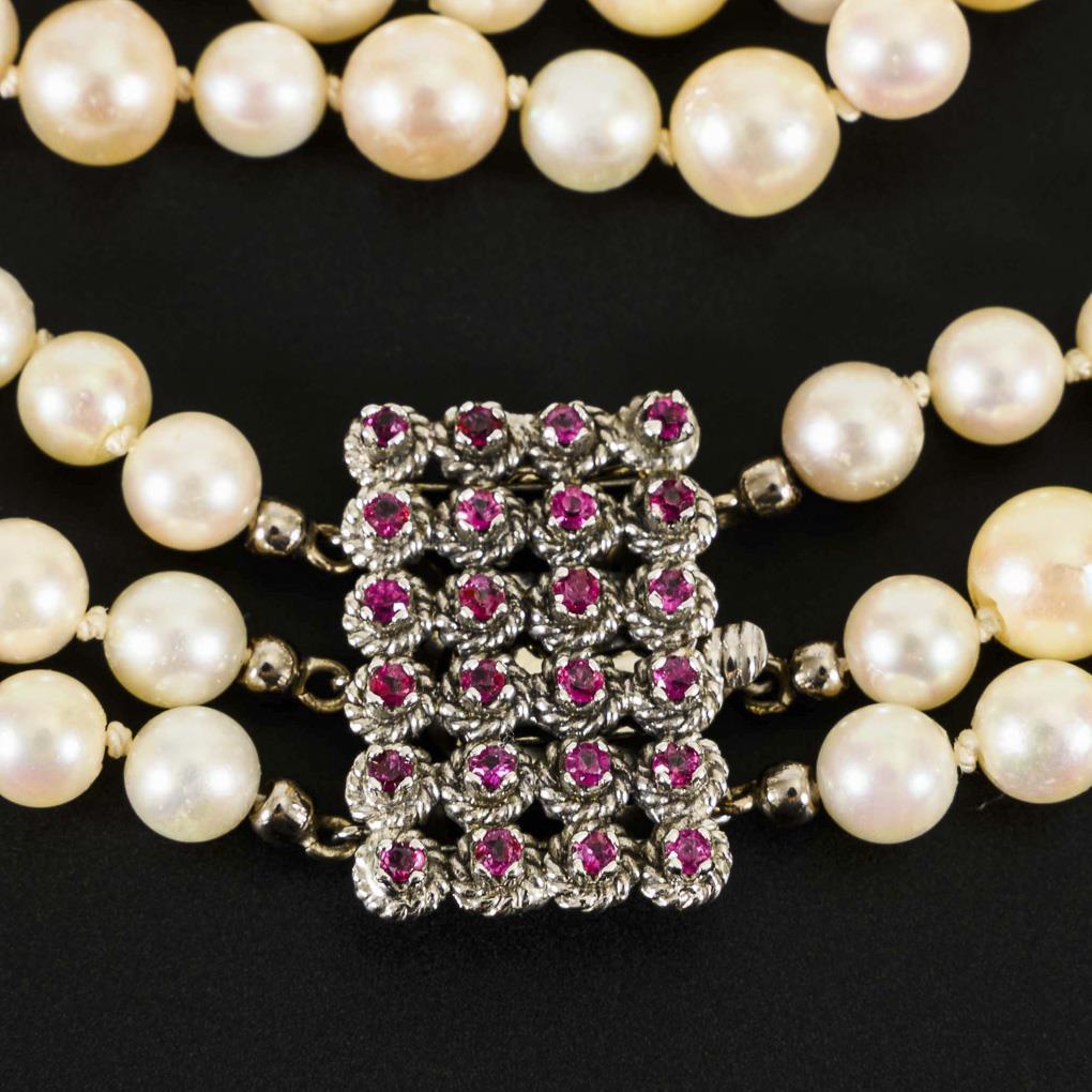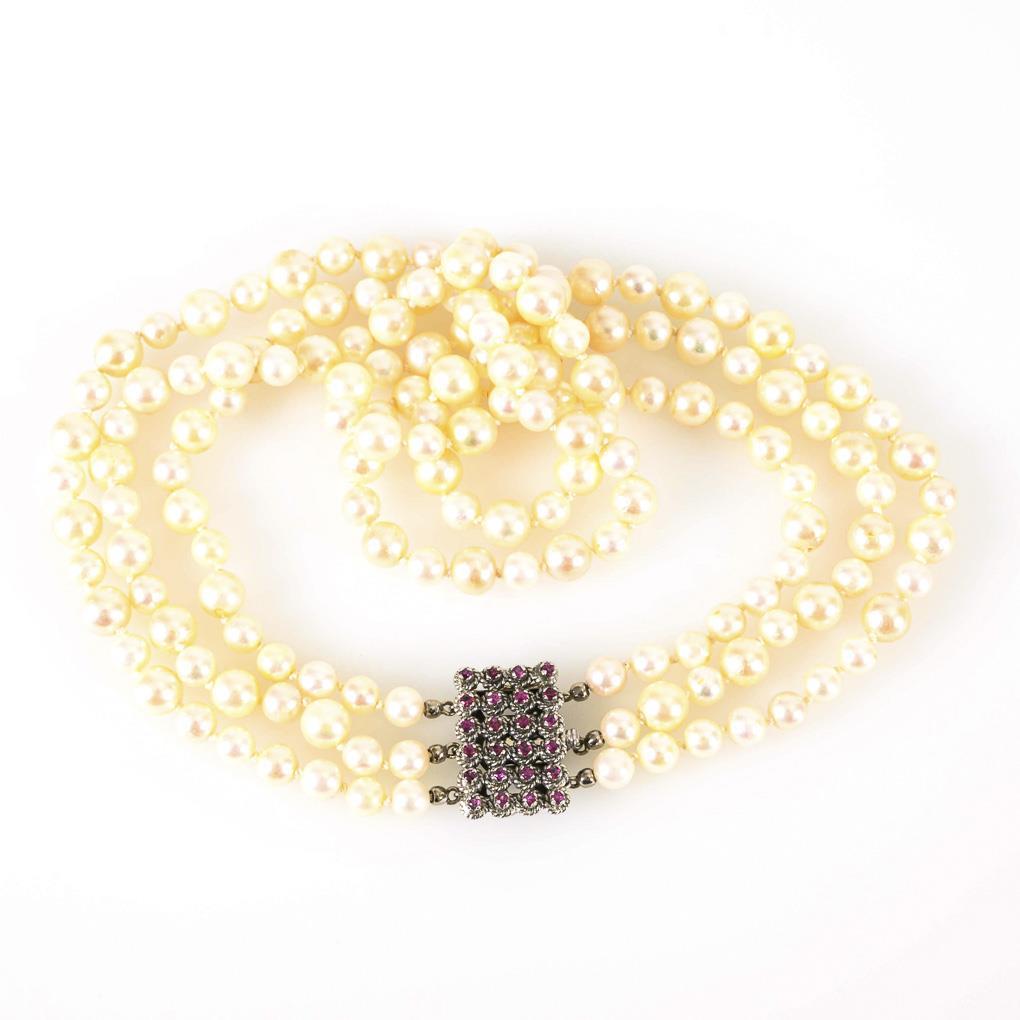 3-row cultured pearl necklace with rubies.