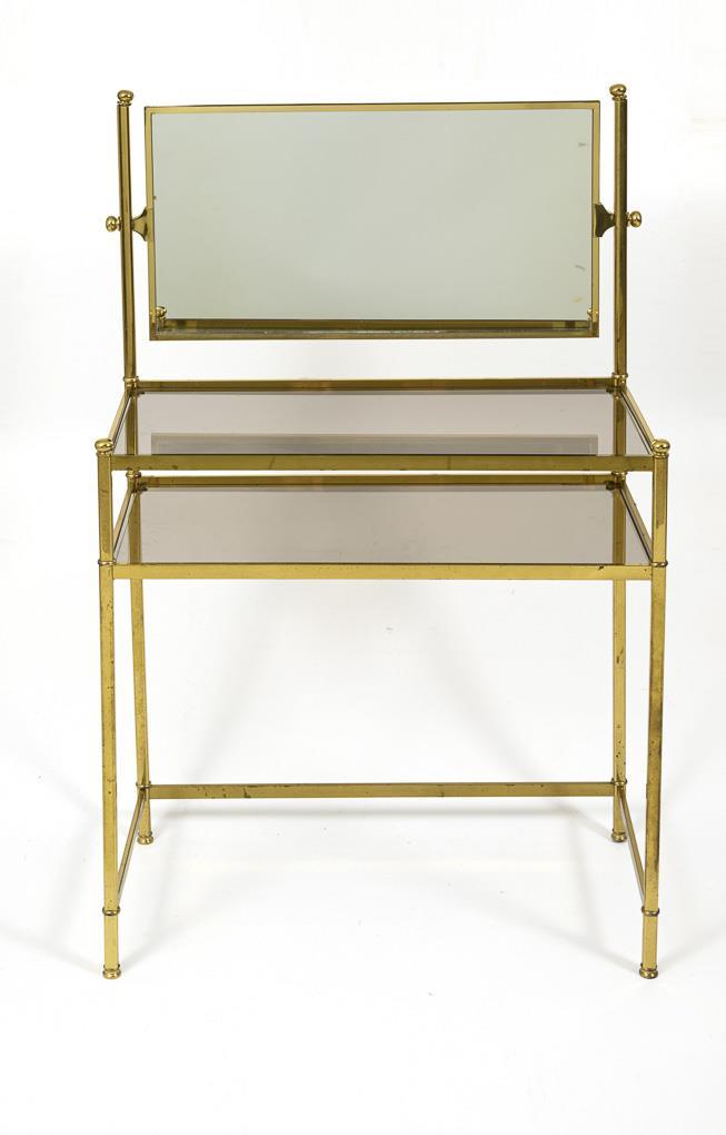Simple design dressing table with rectangular brass frame and swivel mirror, 2 smoked glass shelves. Metal with traces of corrosion, somewhat wobbly.