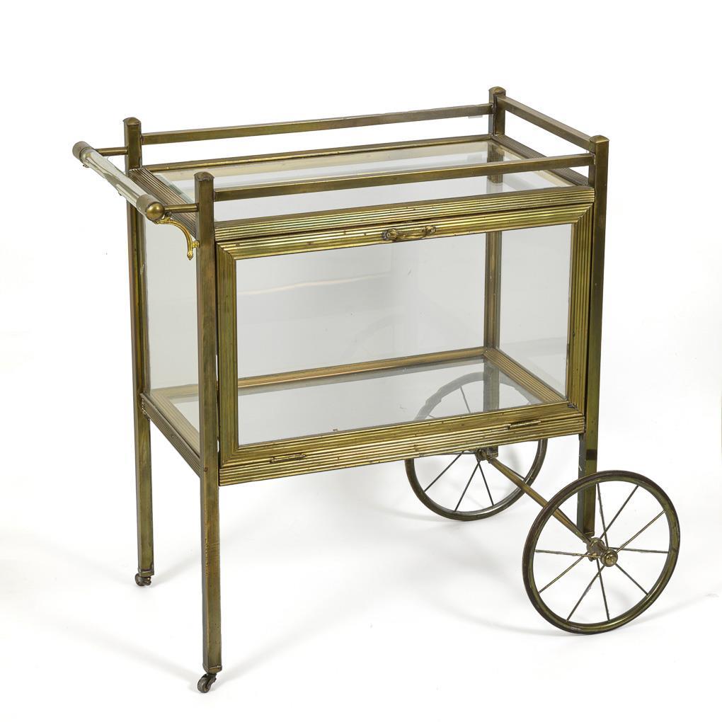 Wheeled tea trolley (so-called Desserte) with brass-clad wooden frame, with glass shelves and glazed body, hinged to one long side, glazed handle. Metal with traces of corrosion.
