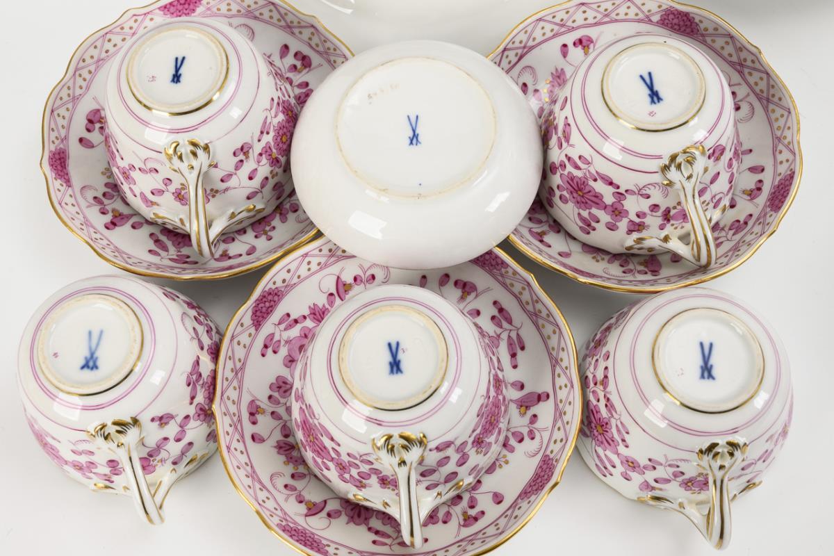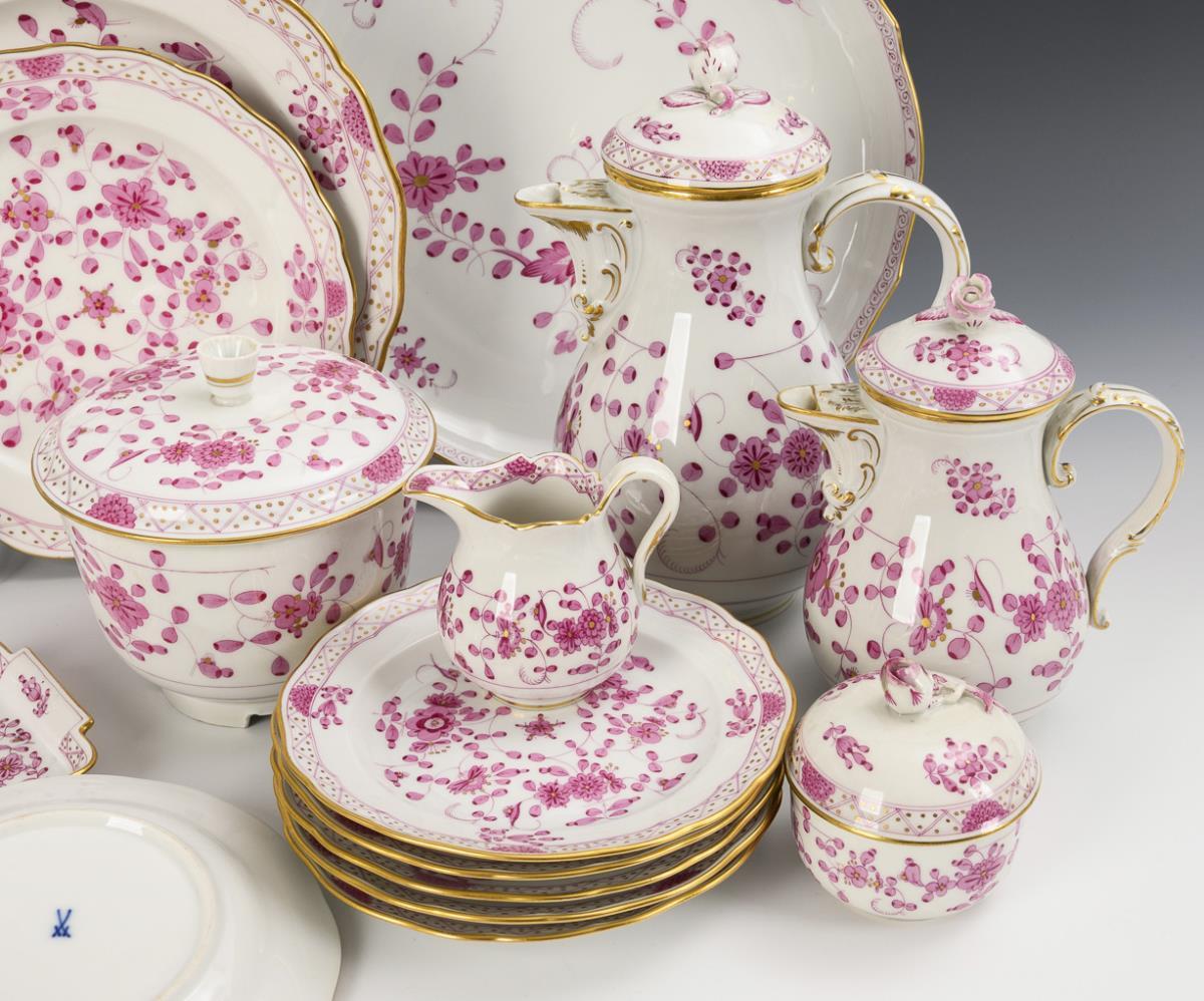 30 pieces. "New cut-out" shape. 2 demitasse pots (H 16.5 and 21.5 cm), 1 milk jug, 1 sugar bowl, 6 demitasse cups, 6 saucers, 6 pastry plates, 1 breakfast plate, 1 dinner plate, 1 bowl (Ø 27 cm), 1 ashtray (L 7.5 cm), 1 ashtray (11 x 10 cm), 1 confectionery dish (this with the "Purple Dragon" decoration; Ø 8 cm), 1 small vase (H 5 cm) and 1 box (H 13 cm). Rose knobs minimally bumped.