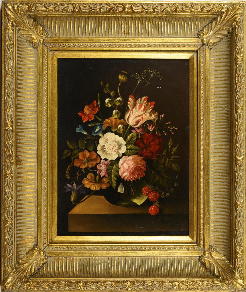 Bouquet in old master style with various flowers and raspberries in glass vase. Minimal traces of age.
