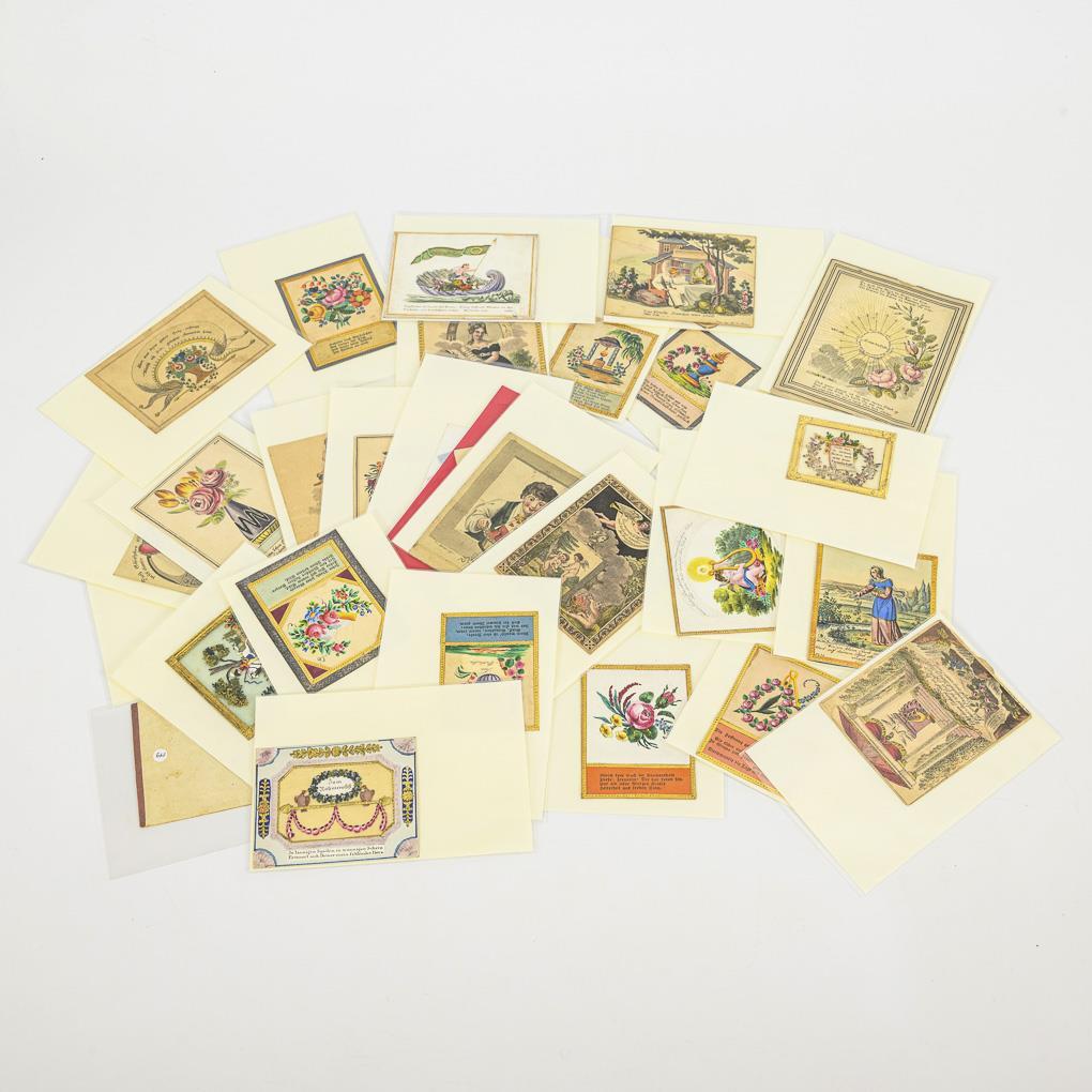 Frequently congratulations and expressions of friendship, including 4 train cards, e.g. "Sun of Love". 1x with handwritten text from 1835. Paper partly browned.