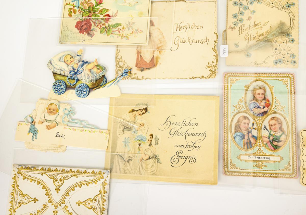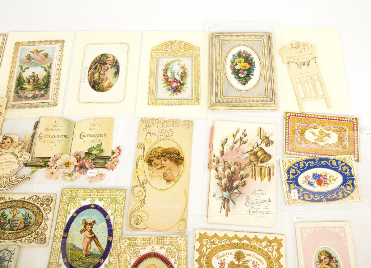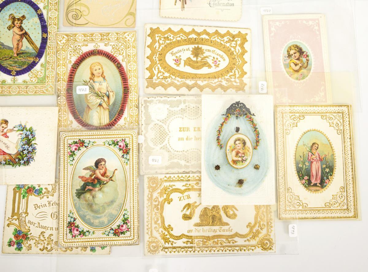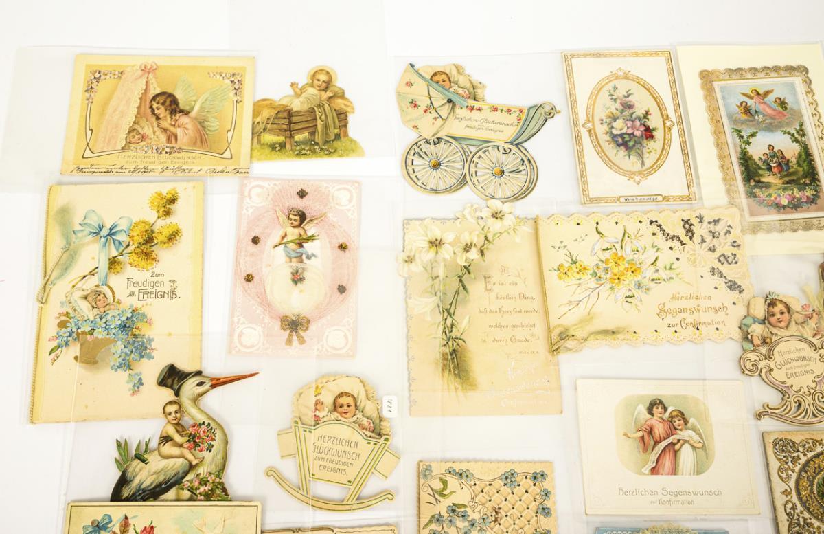 Color lithographs, often embossed, partly punched or movable. Some letters embossed in gold. 1 christening letter in a casket. Set-up picture 14 x 10 cm.