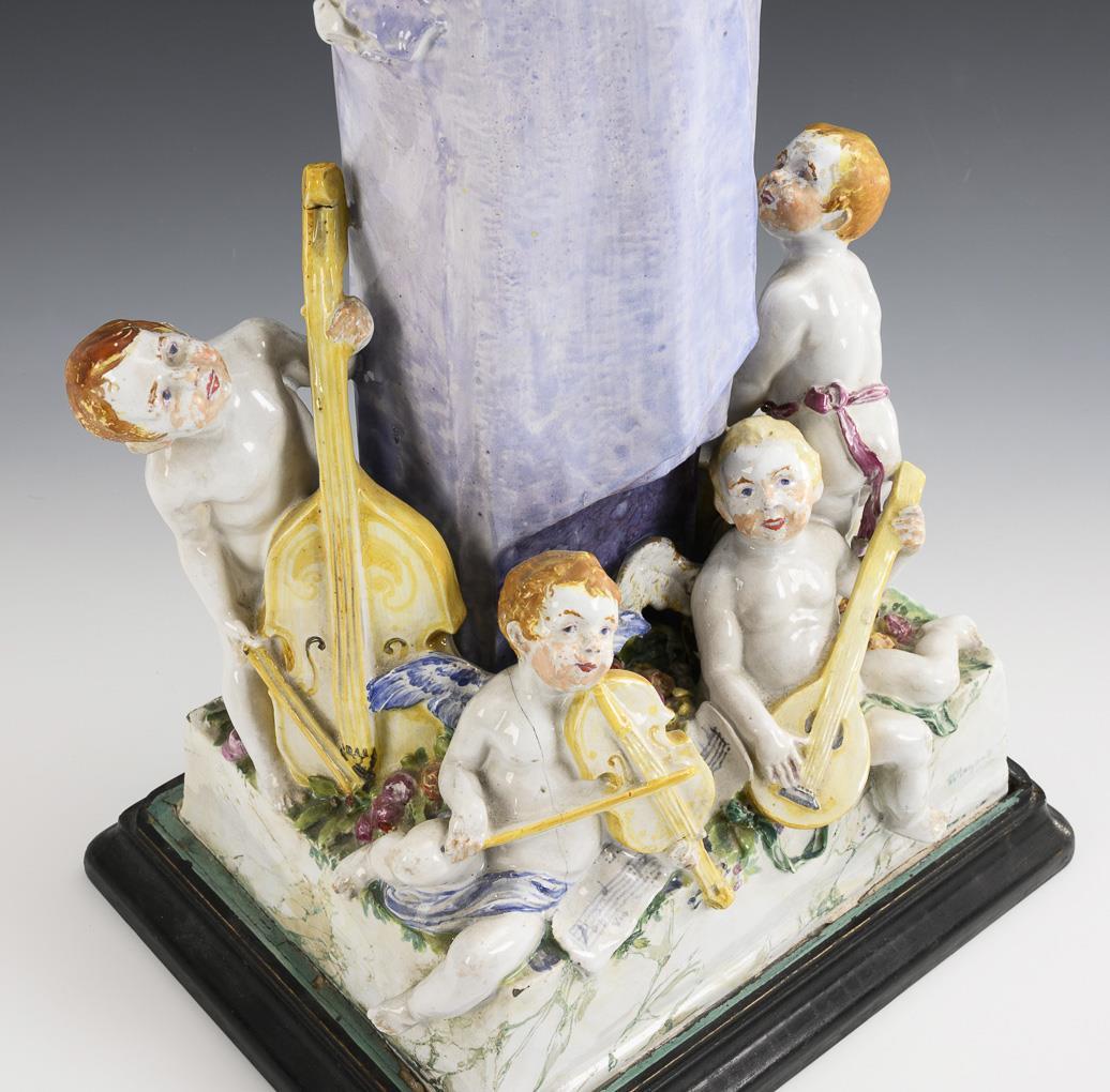 Beethoven standing on a rectangular plinth with his arms crossed, 4 putti playing music at his feet. Ebonized plinth frame. Parts cracked, glued areas, glaze defects and chips.