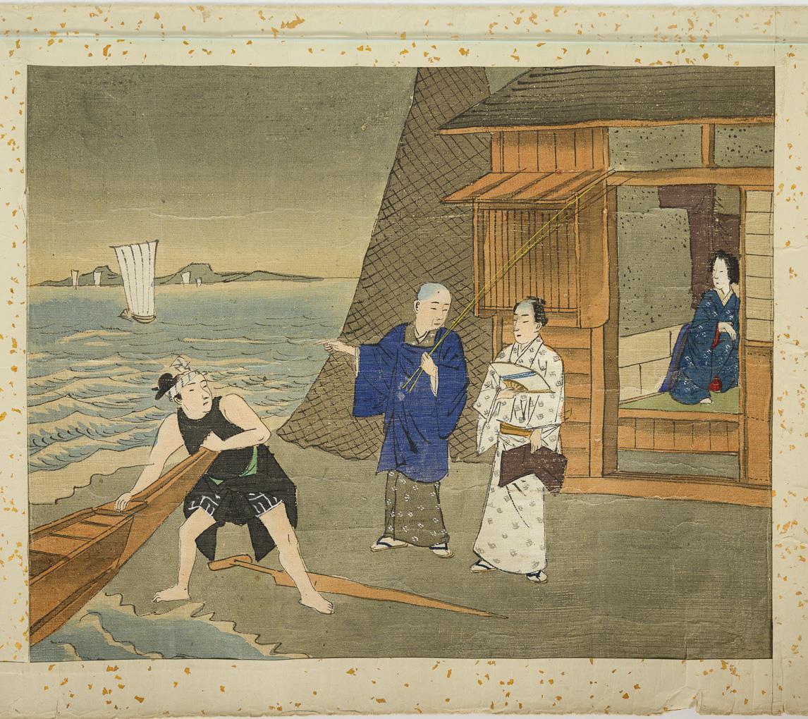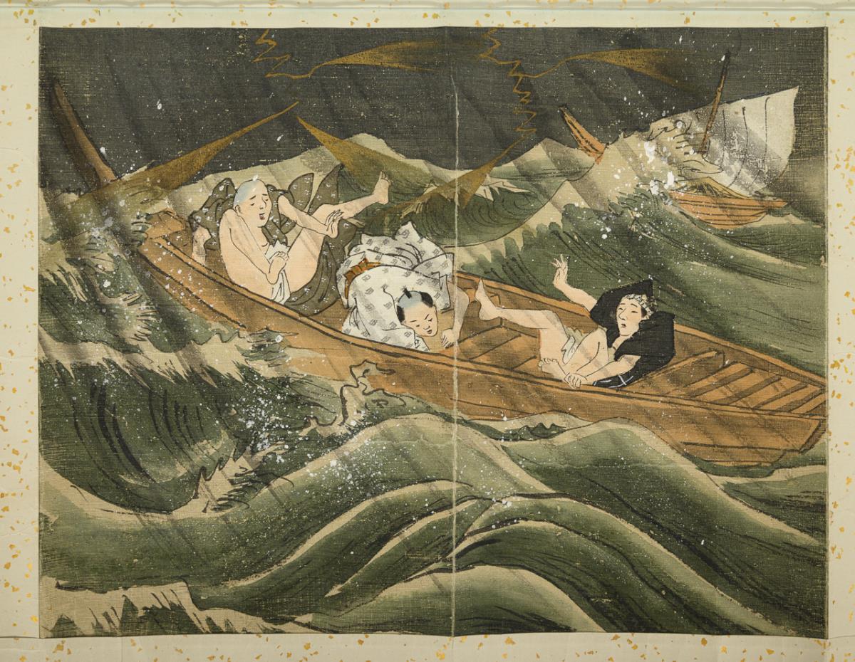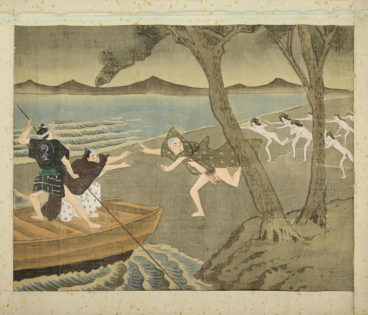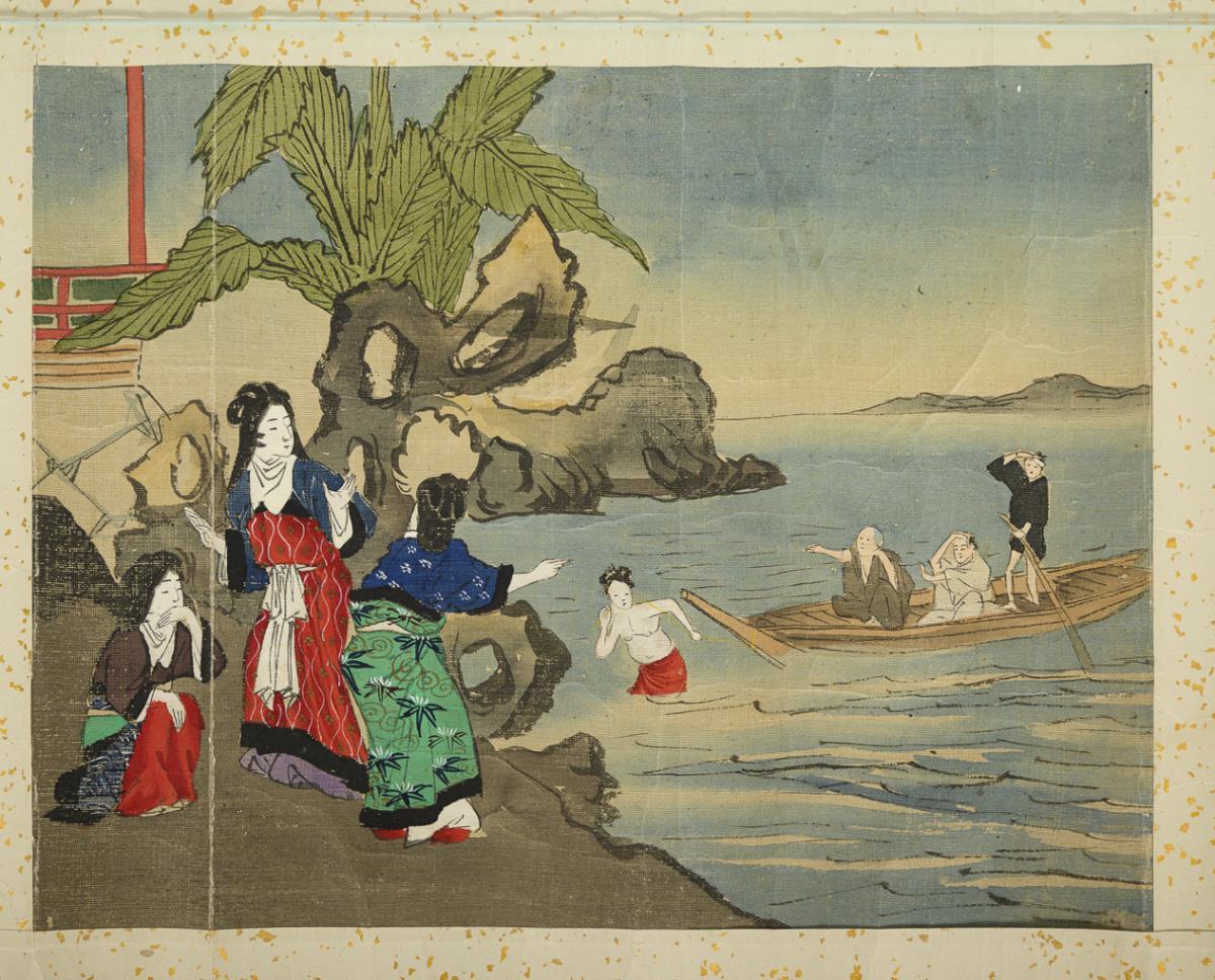 In 12 pictures, the story of three sailors who are swept away by a storm to an island full of women. Colored painting on fabric, mounted on paper with gold tinsel. Scroll end made of bone. Marked signs of wear, creases and a tear.
