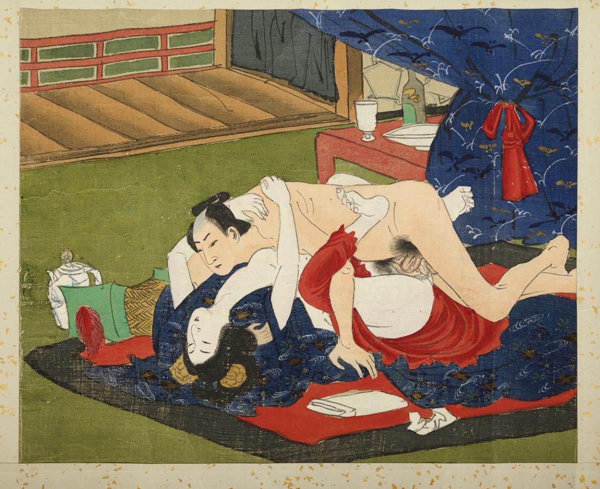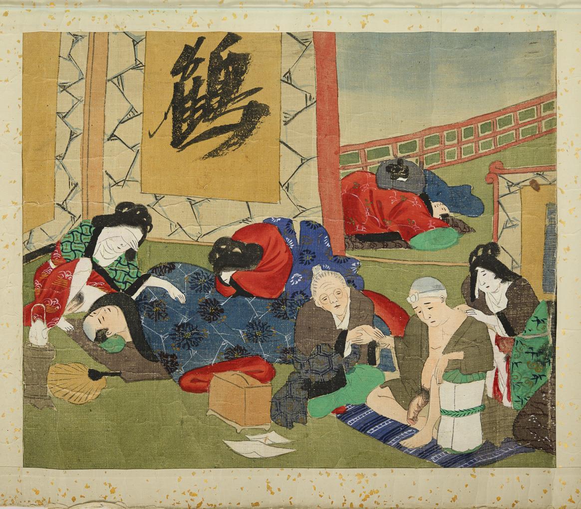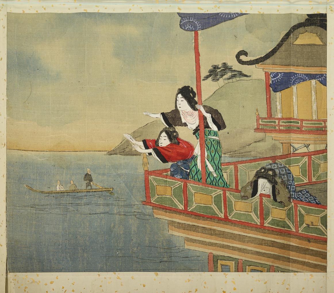 In 12 pictures, the story of three sailors who are swept away by a storm to an island full of women. Colored painting on fabric, mounted on paper with gold tinsel. Scroll end made of bone. Marked signs of wear, creases and a tear.