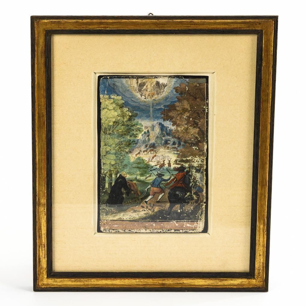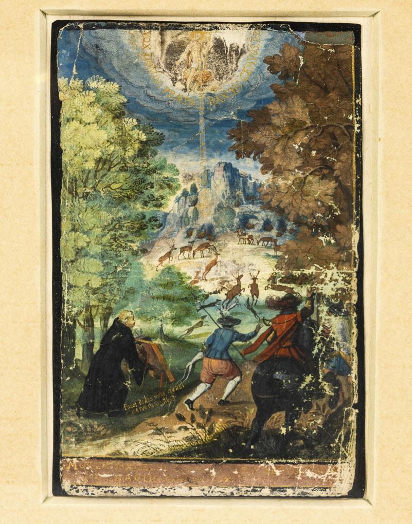 Depiction of a stag hunt in wooded mountains with an apparition of Christ in the sky and gold-colored Latin biblical quotations. Strong traces of age/use, creases, small losses in the margin.