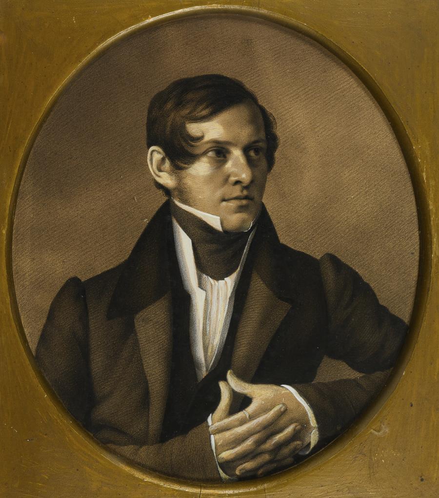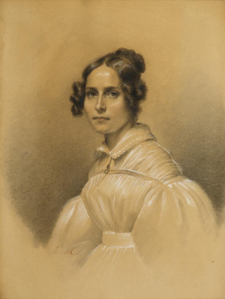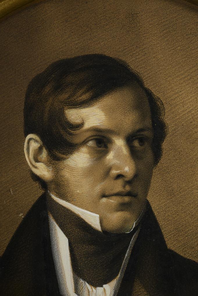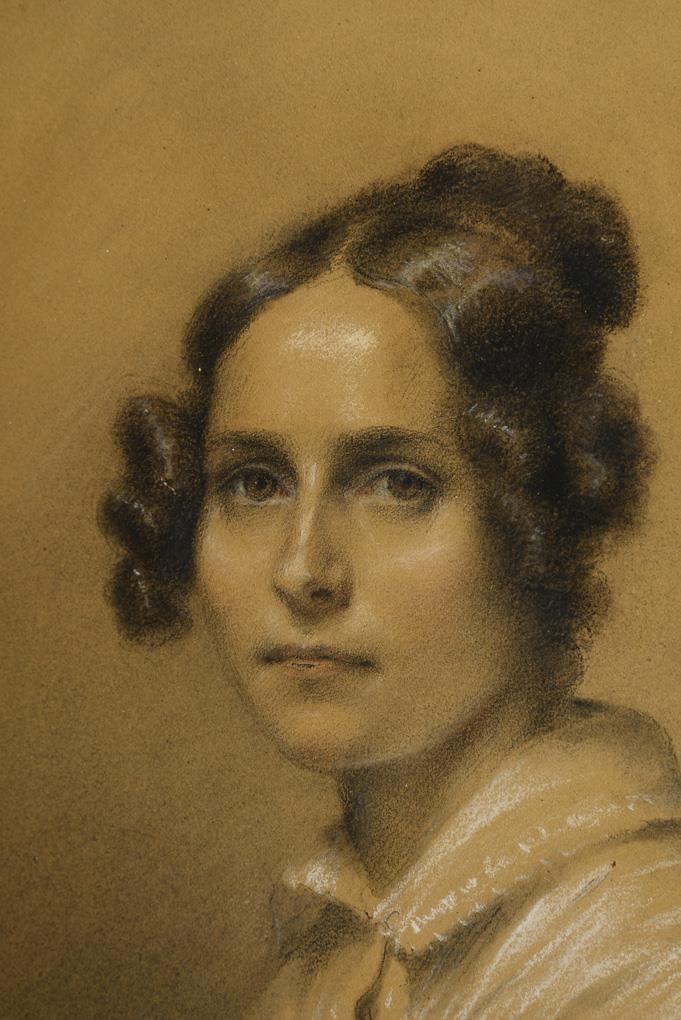 Portrait of the couple in the typical fashion of the 1st half of the 19th century. She with curly hair and in a white dress. He in a dark frock coat with a white shirt and stand-up collar.