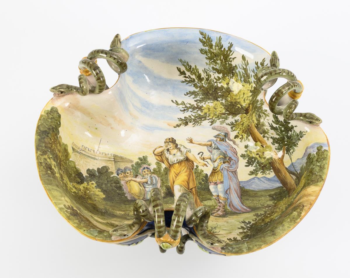 Tripod bowl with leaf-relief wall and 3 sculptural snake handles, on a tripod foot. Interior decoration with antique-style figural scene in a landscape, inscribed on the base "Minone caccia Scilla" (Minone hunts Scilla.). Slightly bumped in places.