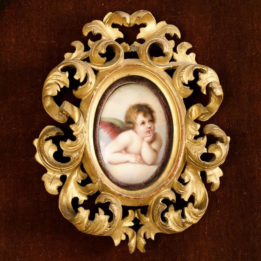 9 oval porcelain plaques with portraits (including Neapolitan Fisherman's Boy after G. K. L. Richter, Portrait of a Vestal Virgin after A. Kauffmann, Beatrice Cenci after Guido Reni, Odalisque after G. Richter, Oriental Woman after N. Sichel), 2 oval plaques with angels after Raphael. All in an elaborately carved, a jour worked, gold-bronzed frame (L 7x 21-26 cm, 2x 10 cm). 1 small console (h 10.5 cm). Carved, octagonal gold frame with astragal and egg-and-dart motif and appliqués: angel's head, vine leaves and empty cartouches to the sides. The lower cartouche inlaid with various woods with bone inlays and a painted monogram on mother-of-pearl. Oval picture surface covered with red velvet. Comes with an oval picture frame (L 11.7 cm). Large frame and small picture frame with minor losses and fine cracks, partly over-bronzed, velvet faded with a few traces of wear, picture frame partly glued.
