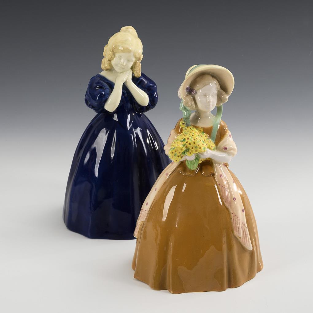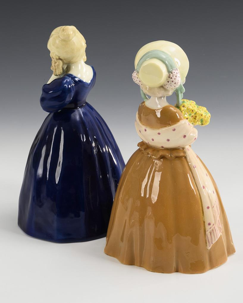 2 standing figures of girls in crinoline dresses. 1x ochre with barge hat and bouquet of flowers, marked "Rosé", stamp mark GS Adler 15, ca. 1905 to 1910, model no. 4083 104 10, ca. 1911/12. 1x dark blue with folded hands, stamp mark GS Adler 16, ca. 1900-1918, model no. 4674 78 9, ca. 1915/16. Each professionally restored.