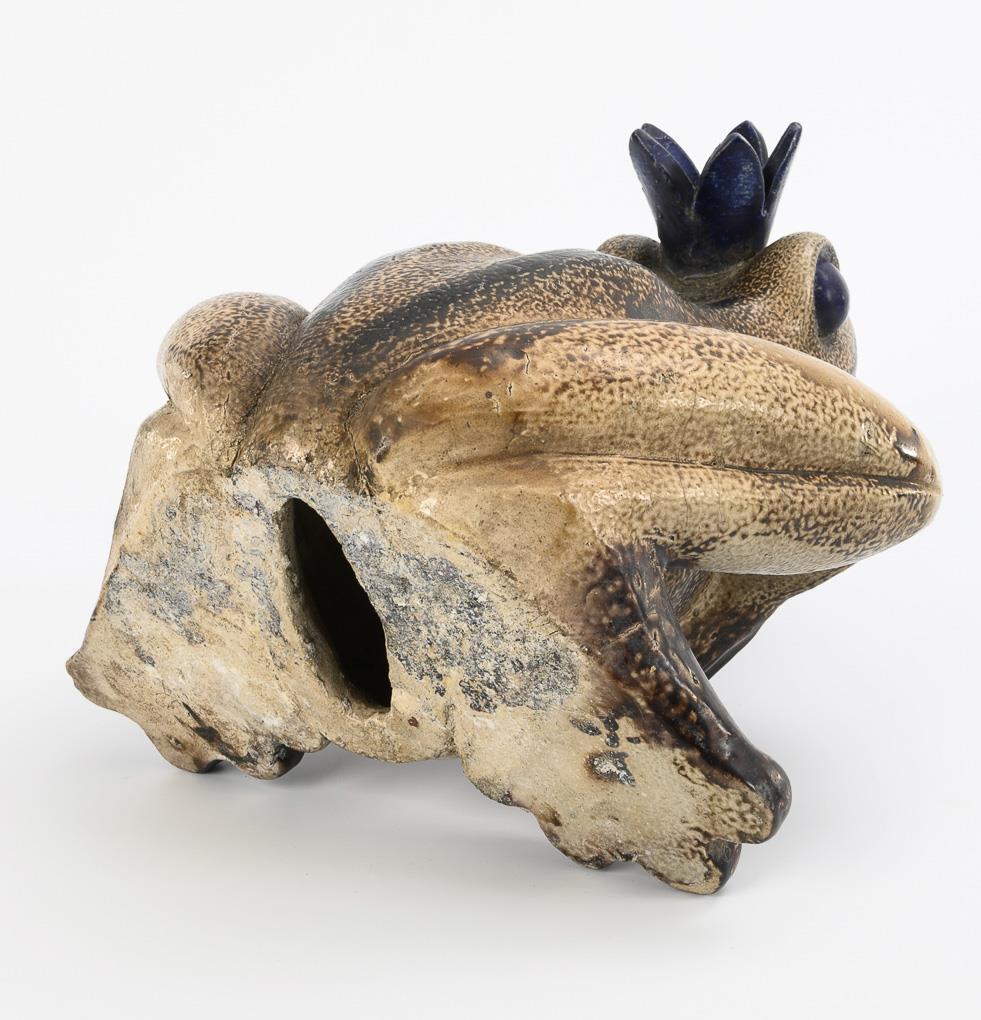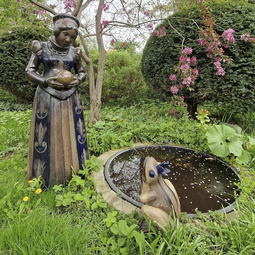 Standing female figure in historicist dress, holding a ball in her hands. In addition, the famous frog figure with a hole in its mouth for spitting water. Partially minimal defects.
