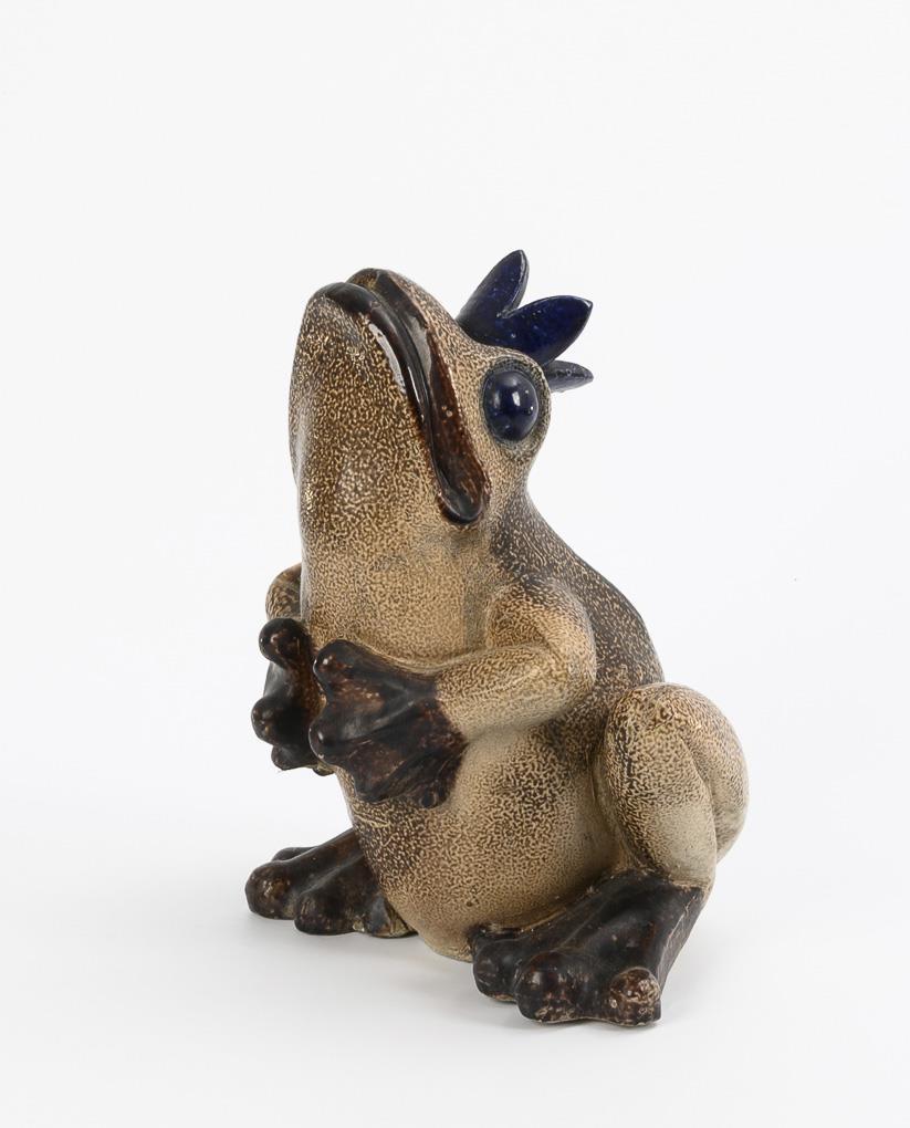 Standing female figure in historicist dress, holding a ball in her hands. In addition, the famous frog figure with a hole in its mouth for spitting water. Partially minimal defects.
