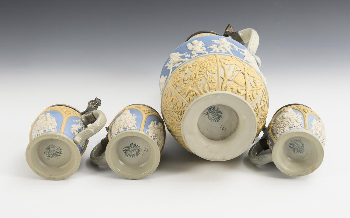 Historicism relief jug with dove-blue wall stripe and a frieze of dancing statues, with spouted niches above, Fasson pewter lid with lever handle. Jugs with arched niches and drinking figures, ceramic lid with star motif and grapes as well as pewter holder. 1 lid with crack, snipe restored on the outside.