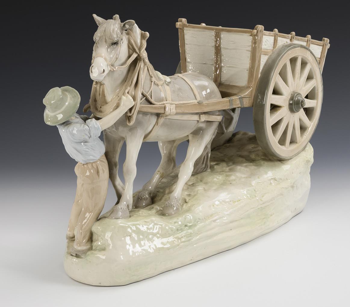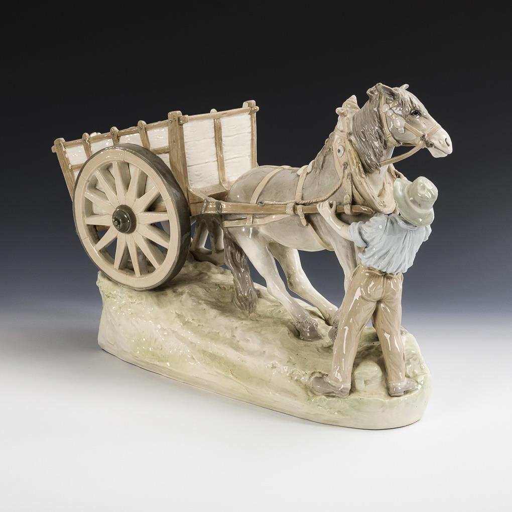Large centerpiece: Farmer with horse-drawn carriage on natural base. Amphora, Turn-Teplitz.