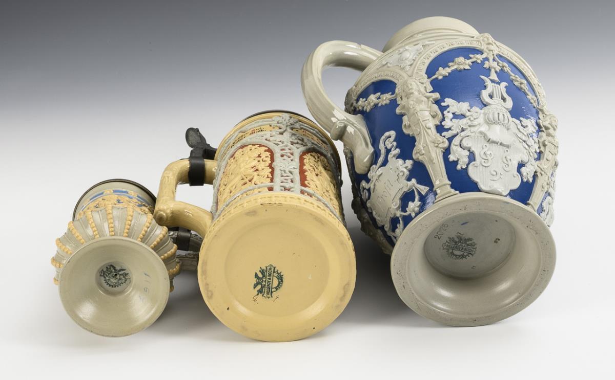 Historism relief vessels with heraldic decoration, figural niches and scrollwork, some with inscription fields. 2x with lid. Some slight signs of age, jug slightly cracked inside.