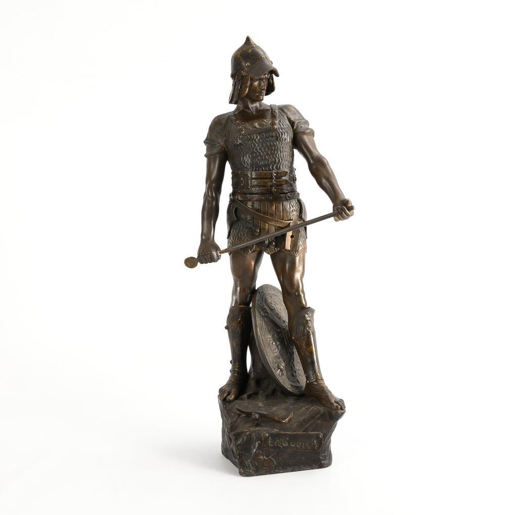 Standing Roman warrior in armor with round shield, sword and axe as an allegory of war, inscribed "La Guerre" on the natural base. With defects, missing parts, replaced loose wooden sword blade, glued sword hilt, rubbing, small chips.