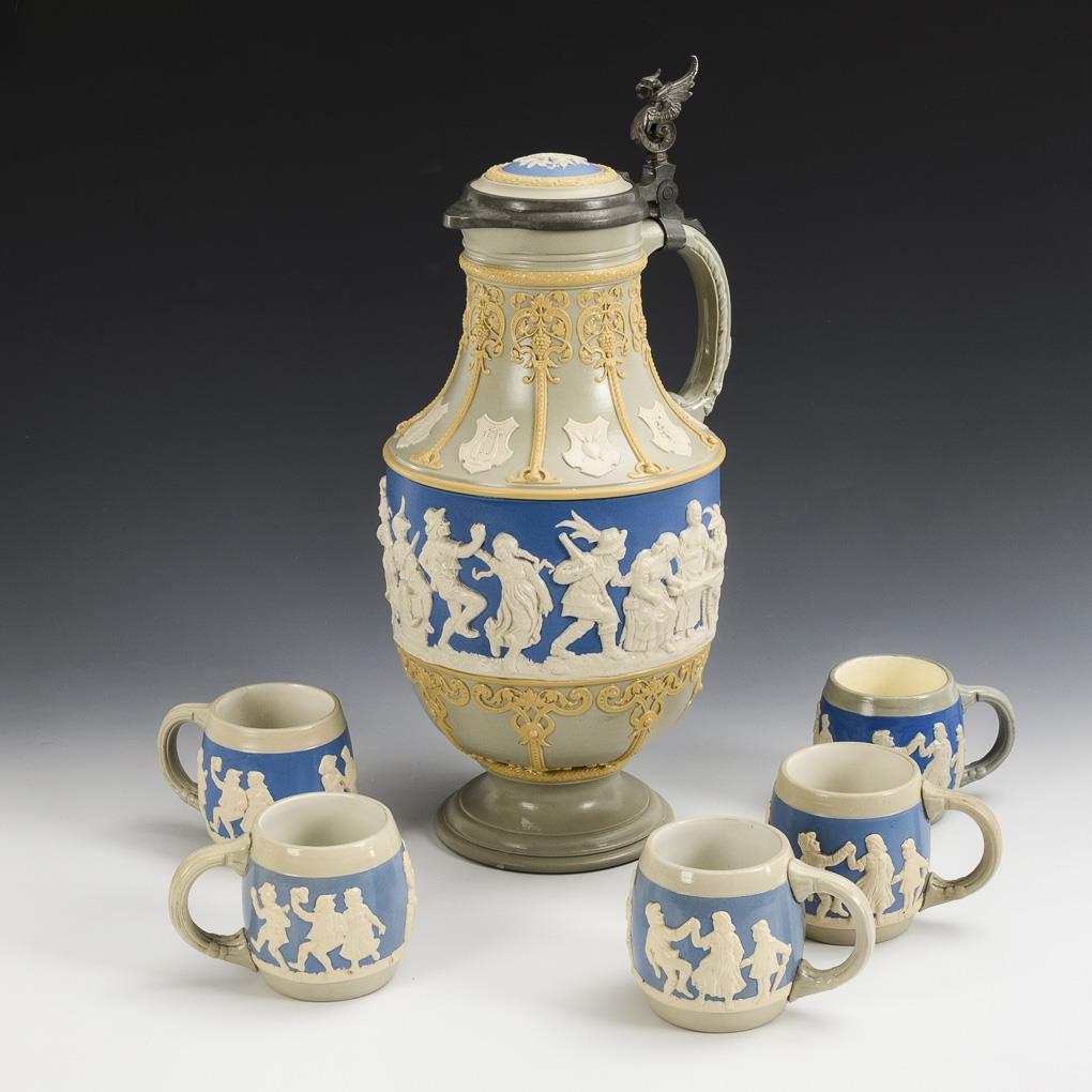 Historicism relief jug with a dove-blue wall stripe and a frieze of figures depicting exuberantly celebrating estates, with decorative armorial fields above, ceramic lid with pewter mount and fabulous handle, engraved "Zum Andenken 22.12.1904". 5 jugs with peasants playing music and dancing.