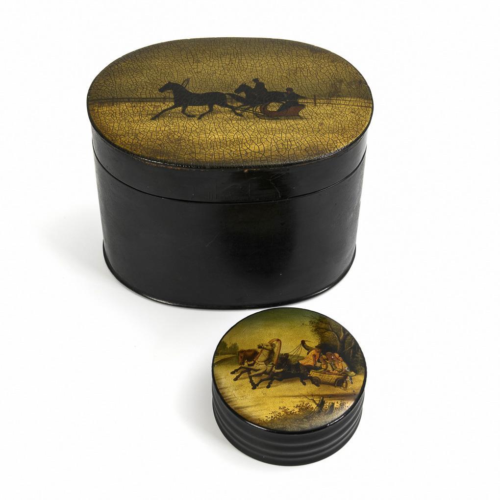 Large oval box (tobacco box?) with one-horse sleigh / Round lacquer box with 3 women in summer troika. Signs of age/use. Lid frame of the large box glued on more recently, retouch on the round box.