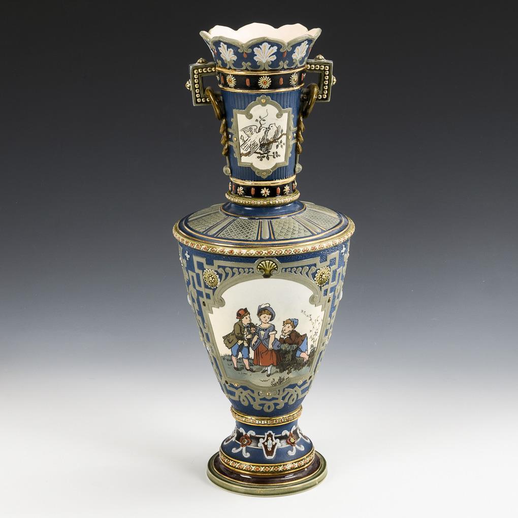 Amphora vase with funnel neck and lateral corner handles with partly sculptural rings, wall in relief with pictorial reserves (child motifs and doves), scrollwork and floral decoration.