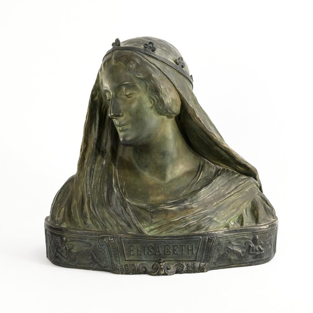 Elisabeth's head tilted to the right with a dreamy lowered gaze, wrapped in a large cloth held by a tiara. Base with figure reliefs, scrollwork in the center with the inscription "Elisabeth". Light glaze rubbing, small chips.