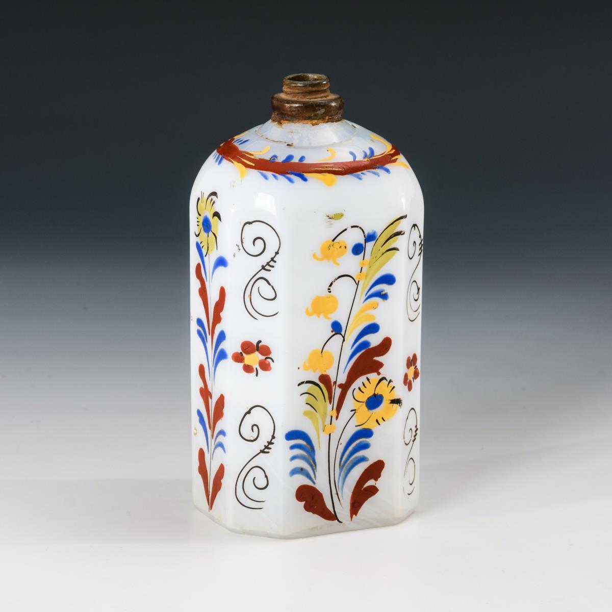 Opalisierendes Milchglas, polychrome Emailmalerei, Zinn-Schraubverschluss, Abriss.