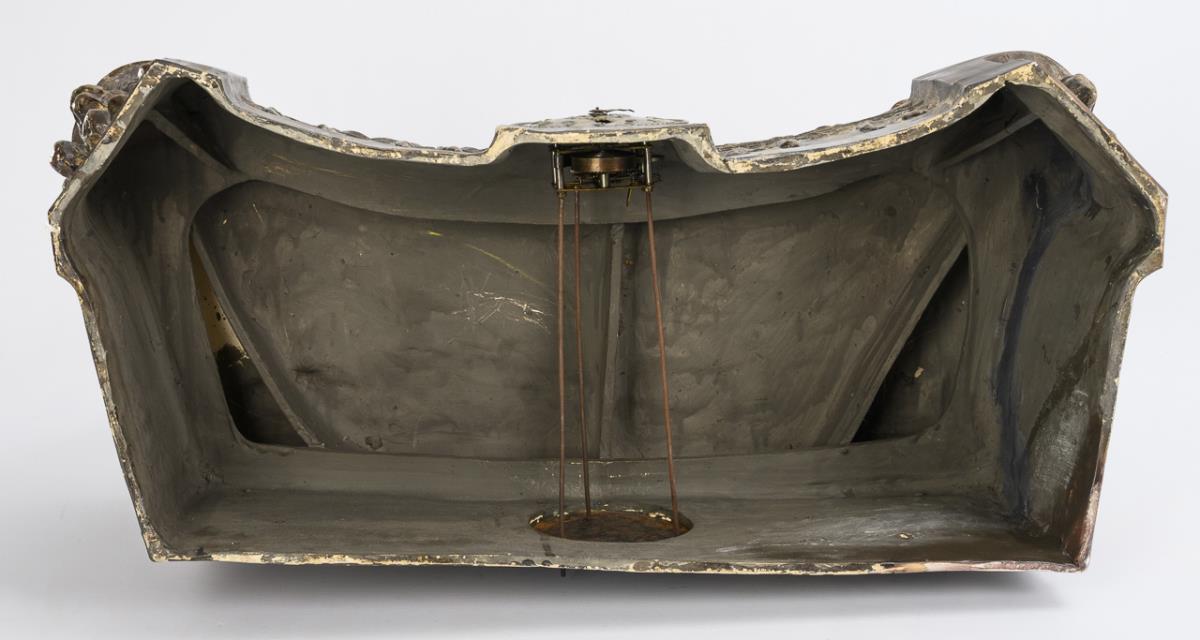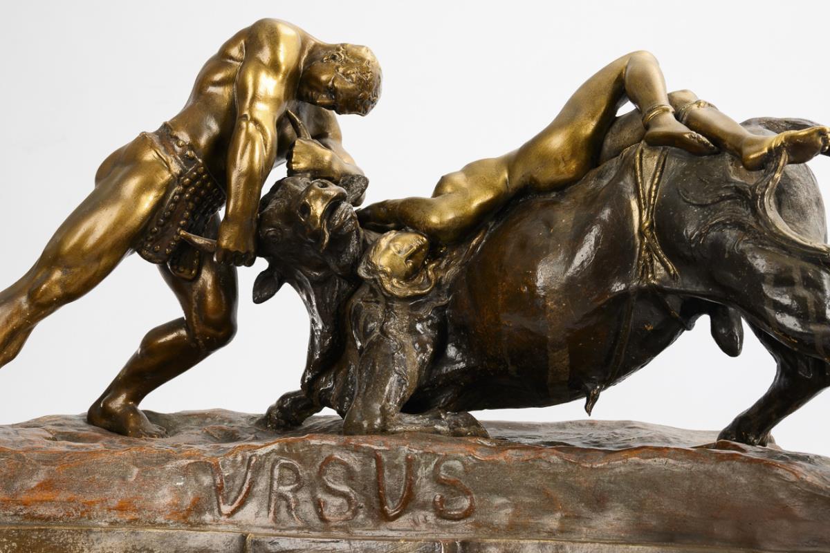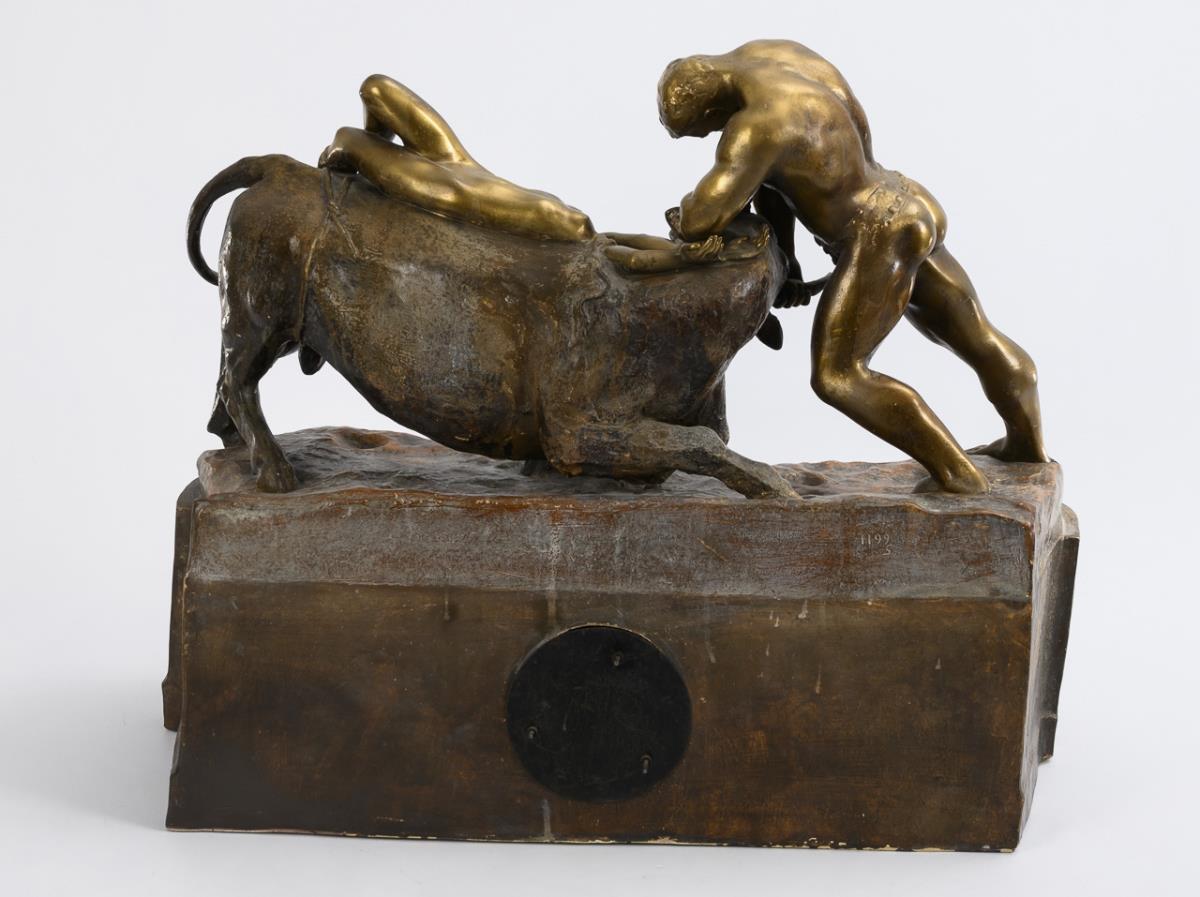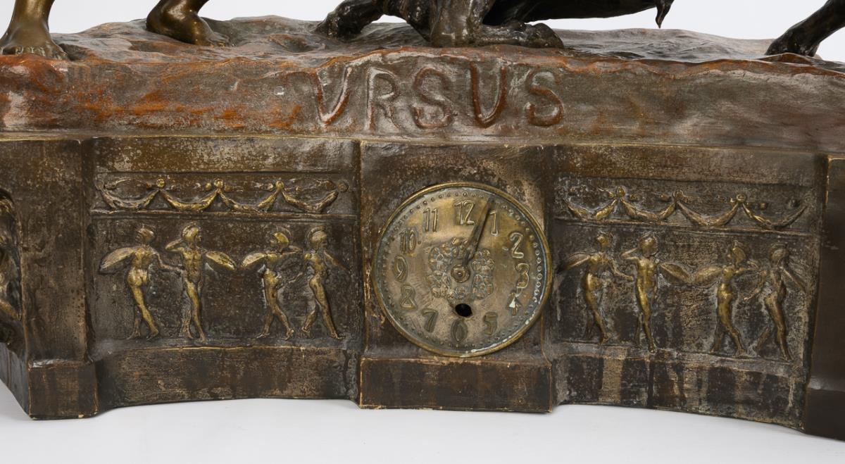 Curved plinth with antique-style figure frieze and lateral lion mascarons, crowned by a flat natural plinth marked "Ursus" with a battle scene between the young warrior Ursus and the bull with a bound girl. Base with Art Nouveau dial, 1 hand missing, movement defective. Slight signs of age and wear, restored, partly cracked.