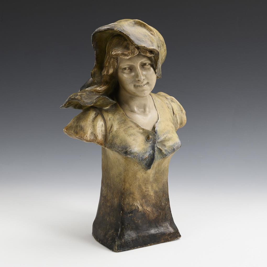 Art Nouveau bust: Young woman with headscarf. Vienna manufactory Friedrich Goldscheider.