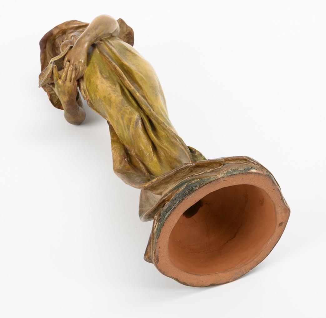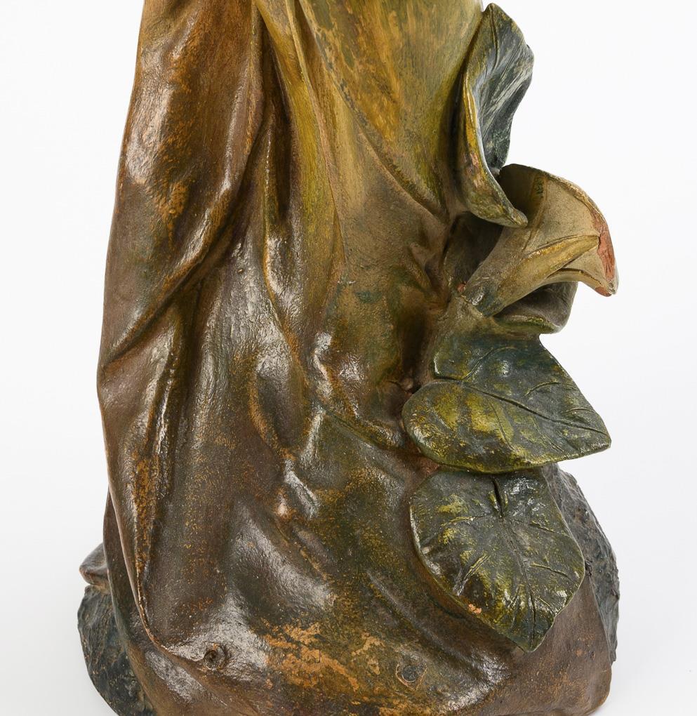 Elegant lady with flowing dress and headscarf, standing on a natural base with bindweed blossoms and foliage. Parts chipped, cracked, repaired.