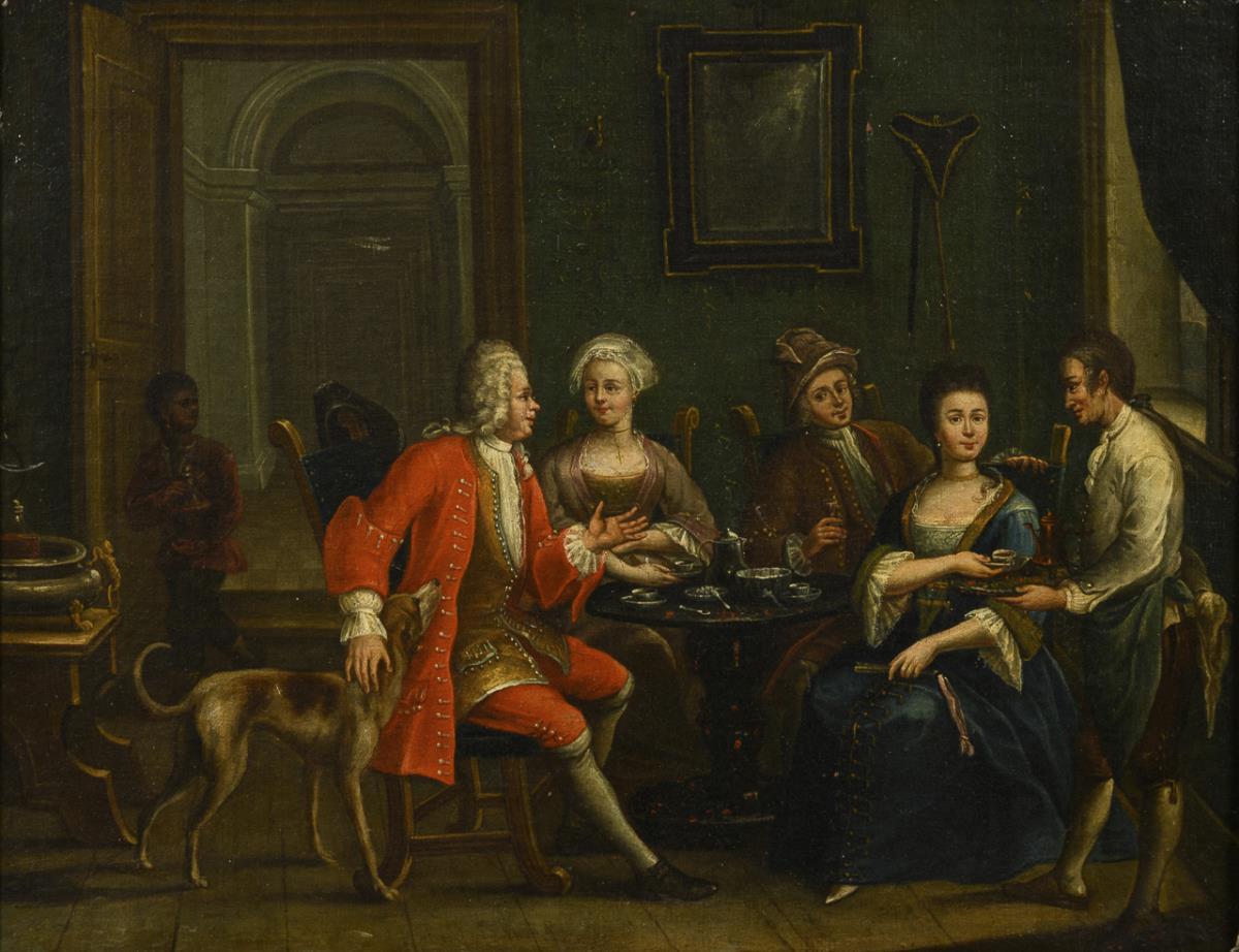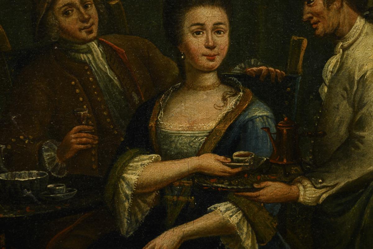 Two noble couples in conversation in the stately rooms surrounded by two servants. Doubled canvas.
