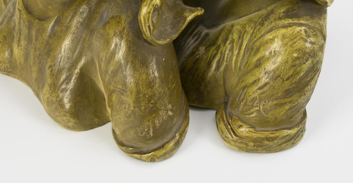 1x Dutchwoman with hood looking to the left "Saat", around 1901/02. 1x Dutchwoman with hood looking to the right "Ernte", around 1900. In "Dechant, Robert E./Goldscheider, Filipp: Goldscheider, Firmengeschichte und Werkverzeichnis" "Lemassi" is given for model no. 2315. Partially slightly bumped, retouched, rubbed.