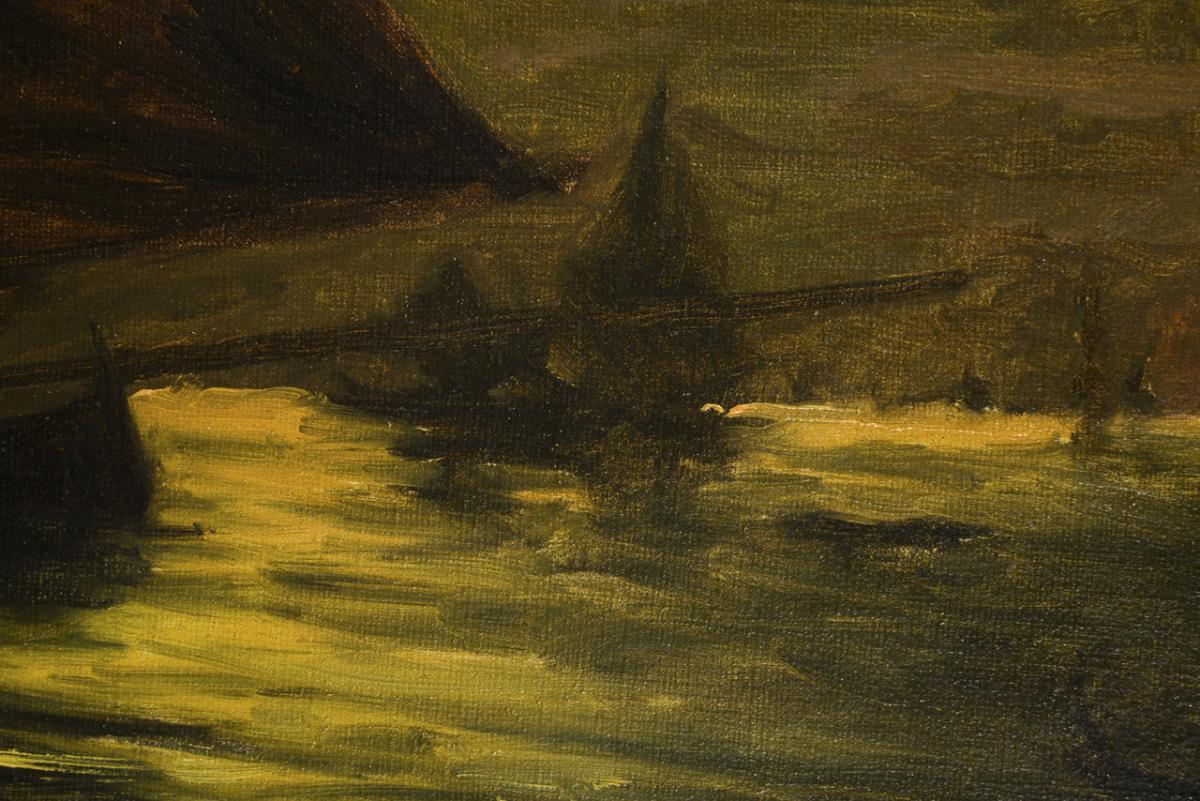 Many boats in the moonlight on the water near the jetty. Two small restored areas with backing.