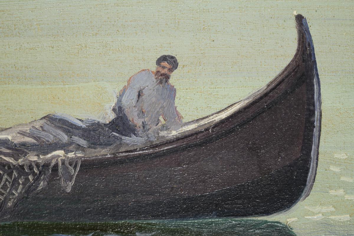 The fisherman on the beach with the boat as the sun sets low and seagulls circle around him.