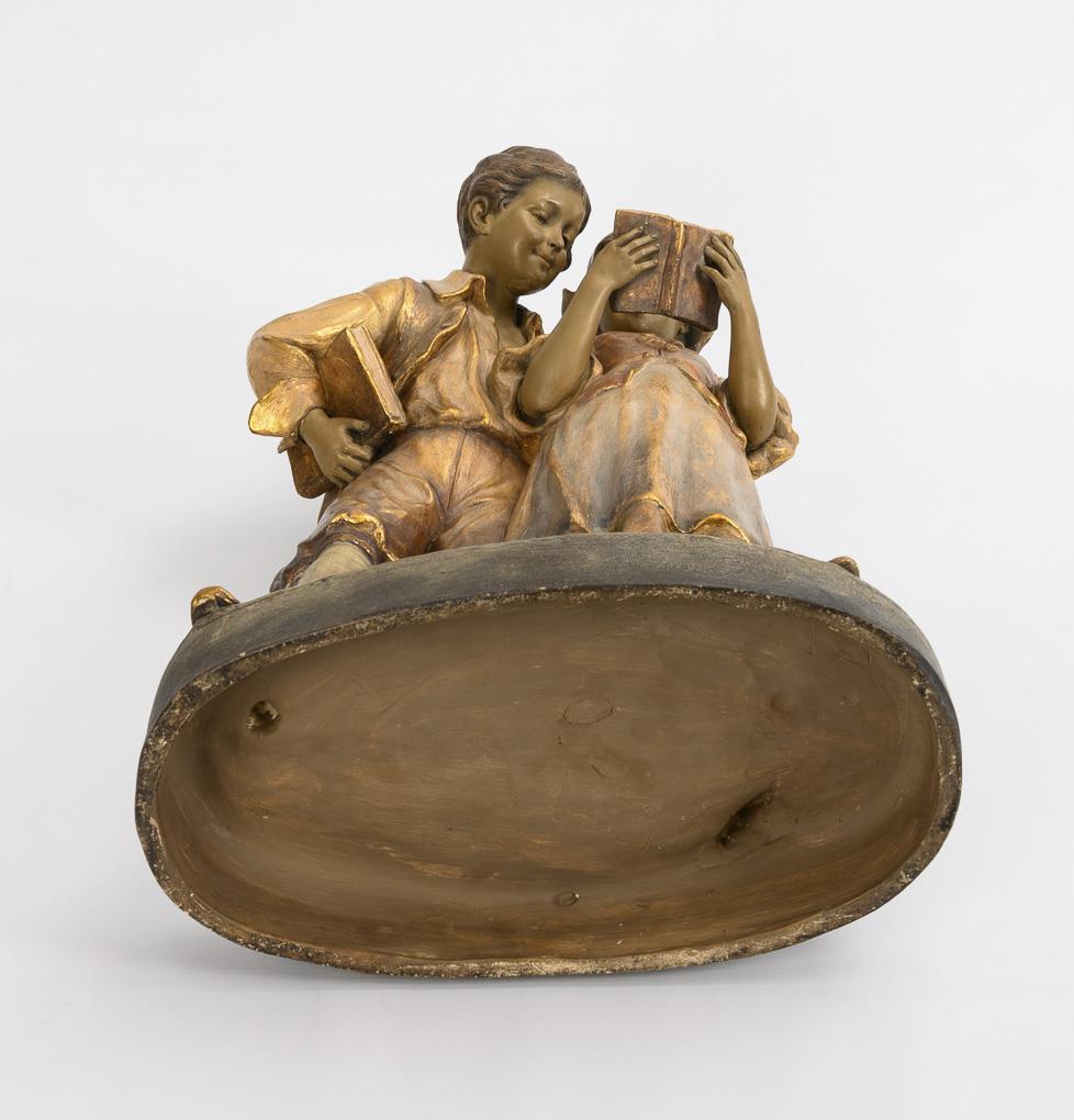 Large Art Nouveau figurine group: Reading children. Vienna manufactory Friedrich Goldscheider.