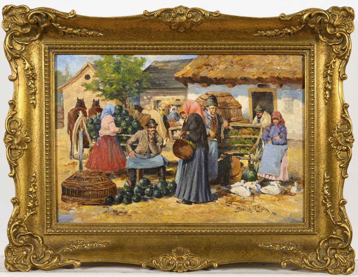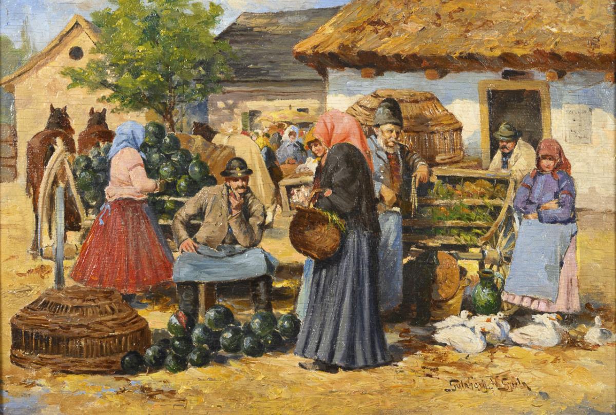Melon and vegetable merchants in the sunshine on the village square with the peasant women. Slight traces of age.