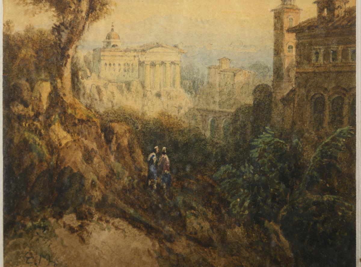 Staffage figures on a path in the mountains with a view of a town in the warm sunshine.