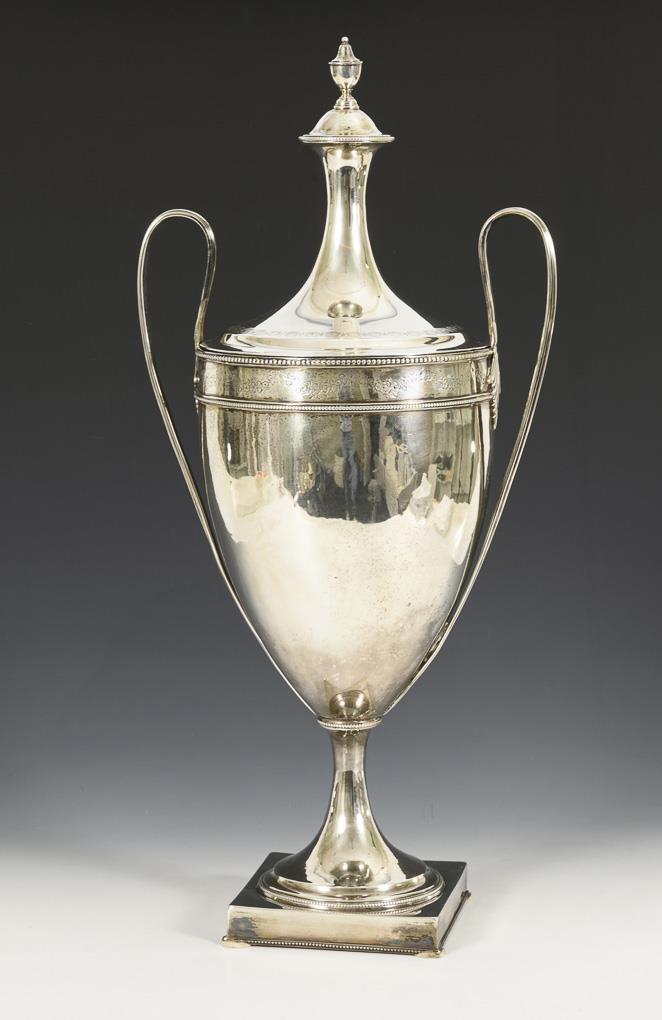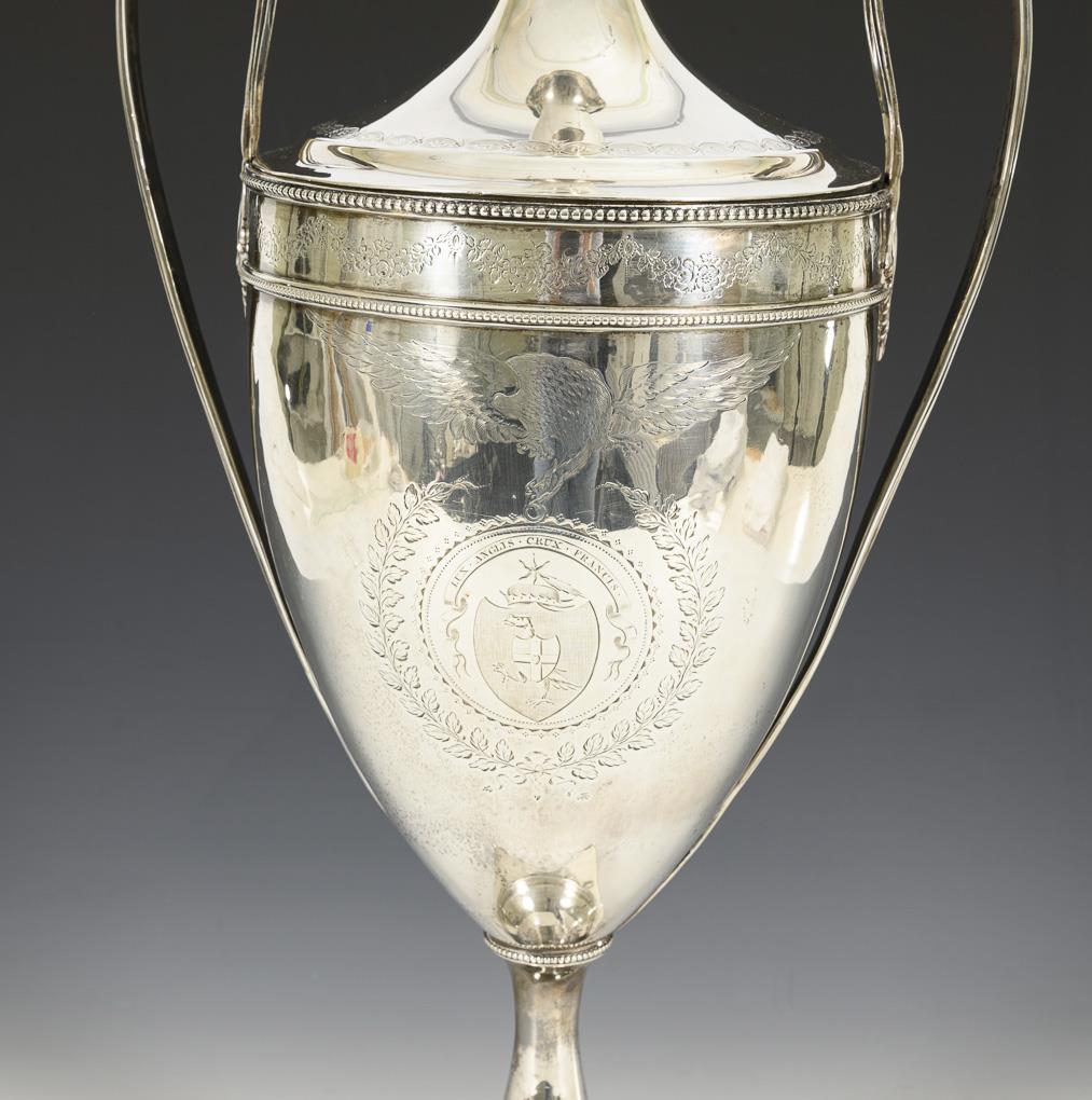 Large classicist lidded goblet with eared handles, on a round foot and square plinth. Decorated with pearl ribbon decoration, engraved flower garlands, engraved coat of arms on the front and the banner "Lux Anglis Crux Francis". From the time of George II. Dents and some soldered areas.