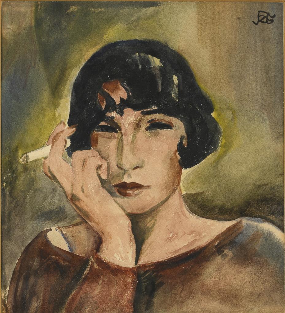 Portrait of a woman in a white dress and portrait of a young woman with a cigarette.