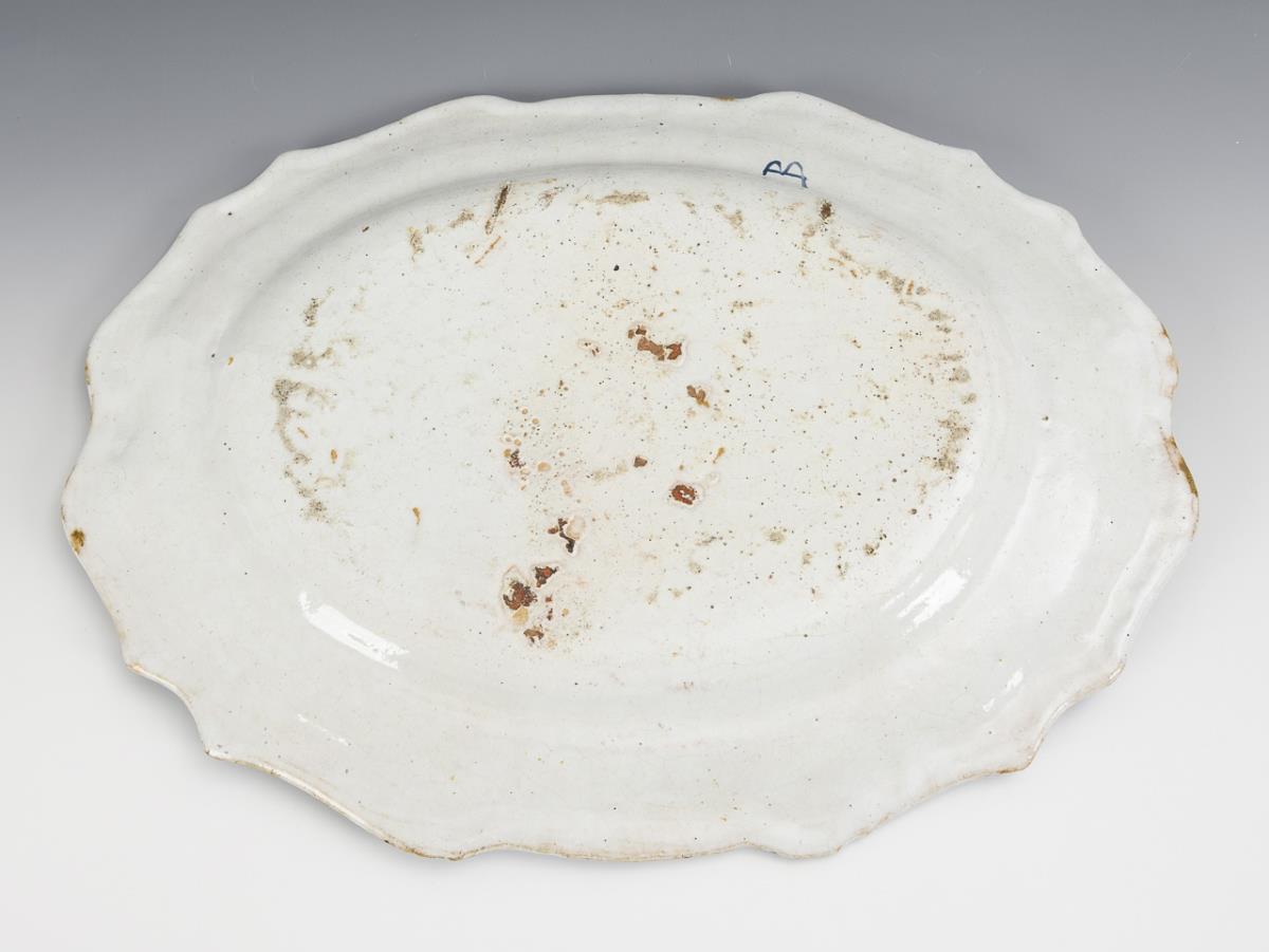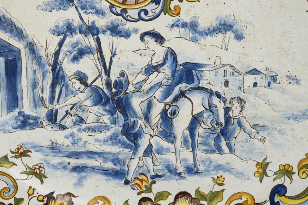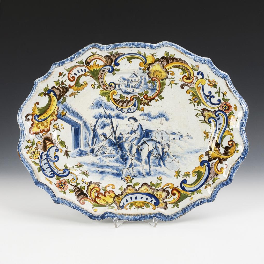 Oval plate with curved rim, in the mirror a landscape with peasants, horse and architecture, flag decorated with rocailles and flowers, at the top a small picture reserve. Glaze rubbing, slightly bumped in places.