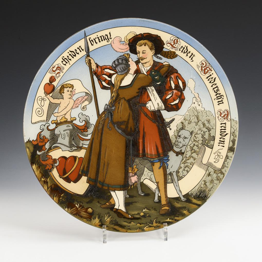 Founding period plate with kissing lansquenet and lady in Renaissance style, dog and coat of arms shield with putto, above a banner with Gothic script "Scheiden bringt Leiden, Wiederseh`n Freuden!".