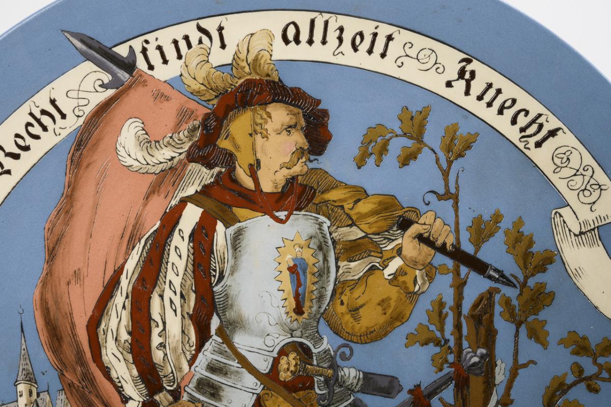 Historicist plates, each with a Landsknecht in a landscape with a castle, above a banner in Gothic script "Gutes Recht findt allzeit Knecht" and "Trutz ohn Macht wird verlacht". Each with suspension.