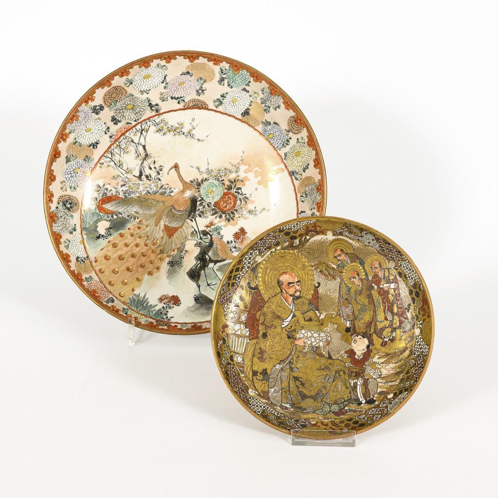 Large bowl with chrysanthemum decoration and round cartouche with a pair of peacocks in a landscape. Underside with wisteria. Marked / Small plate with depiction of a saint in dense painting. Underside with very fine craquelure and subtle ornament.