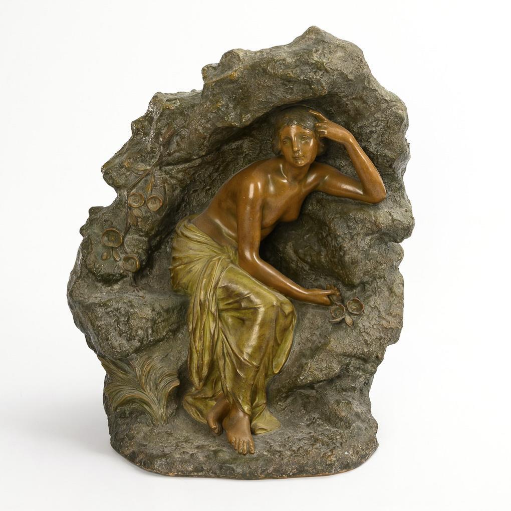 Female half nude with flowers sitting in a naturalistic grotto. Minimal glaze rubbing.