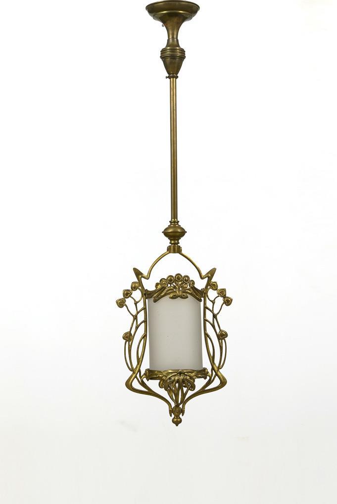 Ceiling lamp with round glass cylinder, surrounded by stylized floral struts with hanging spigots and leaves extending out to the sides. Long round stem with whorl and canopy. Without electrification.