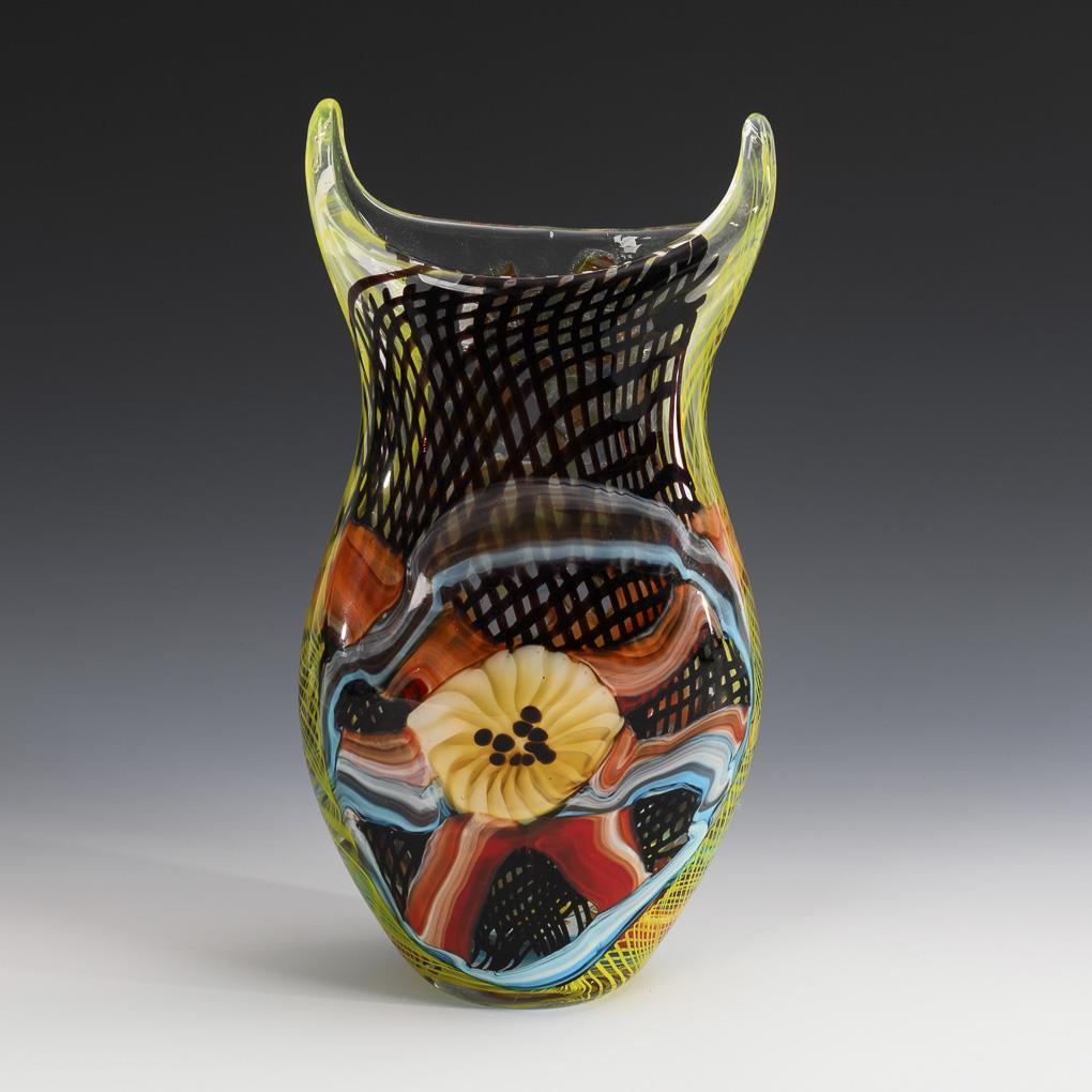 Colorless glass with fused opal yellow spiral threads and colorful fusions of color extending to a flower on both sides. H 38.5 cm.
