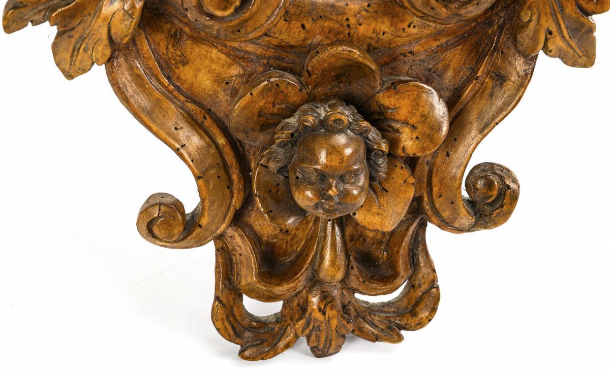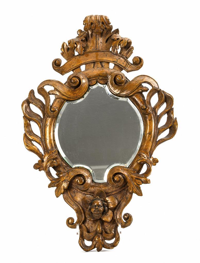 Small ovoid mirror with extremely richly carved volute and leaf decoration and with a mounted putti head at the bottom and an empty panier band on the acanthus finial. Traces of anobia, minor dry cracks and areas of glue, glass replaced.