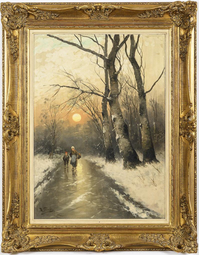 Staffage figures on the icy path in the snow-covered forest in low sun. Slight traces of age.