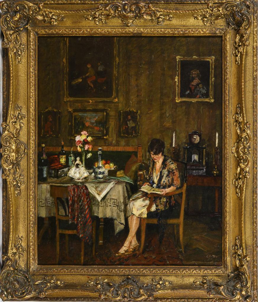 Young woman with book at a table decorated with bottles, vases and porcelain figure in front of a wall with paintings. One small restored area with backing.